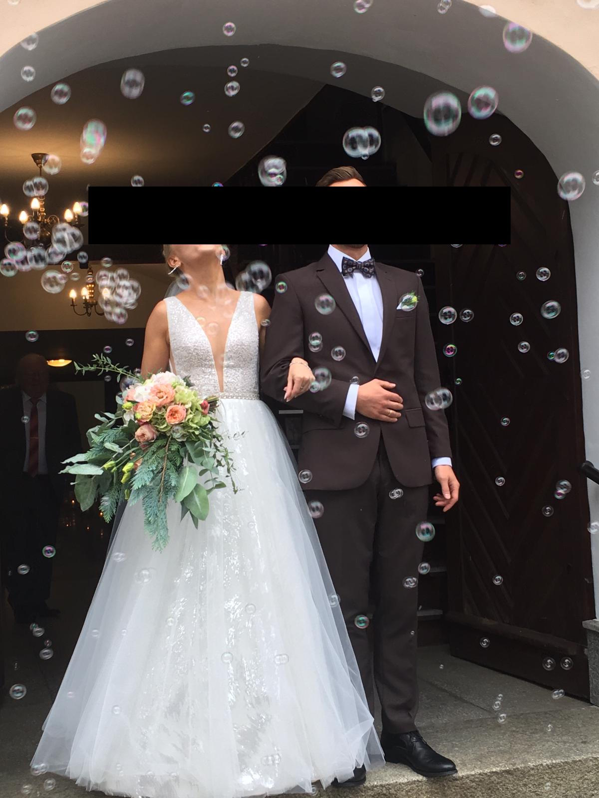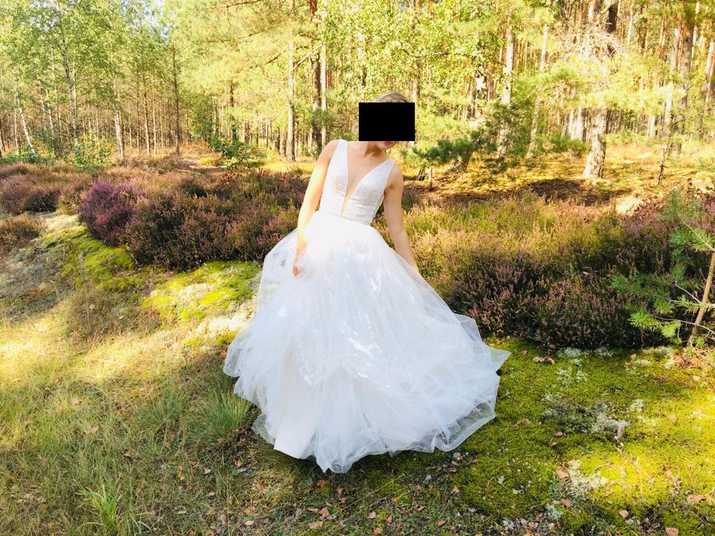 Mam do sprzedania śliczną suknię ślubną z bardzo efektowną górą i dekoltem. Cała góra podszyta jest (na moje dodatkowe zamówienie) delikatnym, nie drapiącym materiałem. Wszystkie elementy takie jak plecy i dekolt są pokryte cielistą siateczką, dzięki temu suknia pięknie wygląda ale jest bezpieczna w tańcu i bardzo wygodna. W gorsecie wszyte są miseczki w rozmiarze 75B ale z łatwością można wszyć inne. Góra cała wyszywana koralikami. Dół cały z tiulu w tym jedna z 5-ciu warstw jest wyszywana cekinami, dzięki temu zarówno góra jak i dół pięknie się mieni. Do sukni jet też oddzielna halka z kołem. Suknia zapinana na plecach rzędem guzików (kryształki) Dzięki gorsetowi na ramiączka suknia świetnie się trzyma, nie przesuwa i spokojnie wytrzymałam w niej całą noc do białego rana. Suknia była dopasowywana na moje wymiary: 166 cm wzrostu, rozmiar 36. Suknia została oddana w profesjonalnym salonie do czyszczenia oraz poprawek. Chętnie odpowiem na wszystkie pytania, podeślę więcej zdjęć.