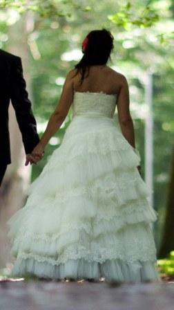 Suknia w rozmiarze 38, szyta na osobę o wzroście 160-165 plus obcas. Jest możliwość doszycia kilku warstw od dołu na wyższą osobę. Suknię można poszerzyć bądź zwęzić.