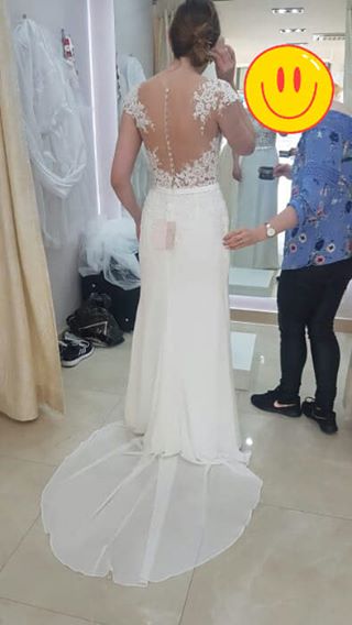 Suknia ślubna ecru założona na ślub i wesele, bez sesji w plenerze. Na wzrost 168, przy butach na obcasie 4.5 cm. Mój rozmiar S, wszyte miseczki. Lekkie ślady użytkowania, w stanie bardzo dobrym. Wygodna, pięknie się układa w tańcu, tren podpinany na guzik (widać na jednym zdjęciu jak wygląda po podpięciu a na innym rozwinięty, można go obciąć). Dołączam szal, który posłużył mi tylko w drodze do kościoła. Model Gala Apate 2018, w którym obcięte zostały rękawy. Suknia kupiona w salonie sukien ślubnych we wrześniu 2018. Ślub odbył się w tym roku w kwietniu, suknia wyprana.