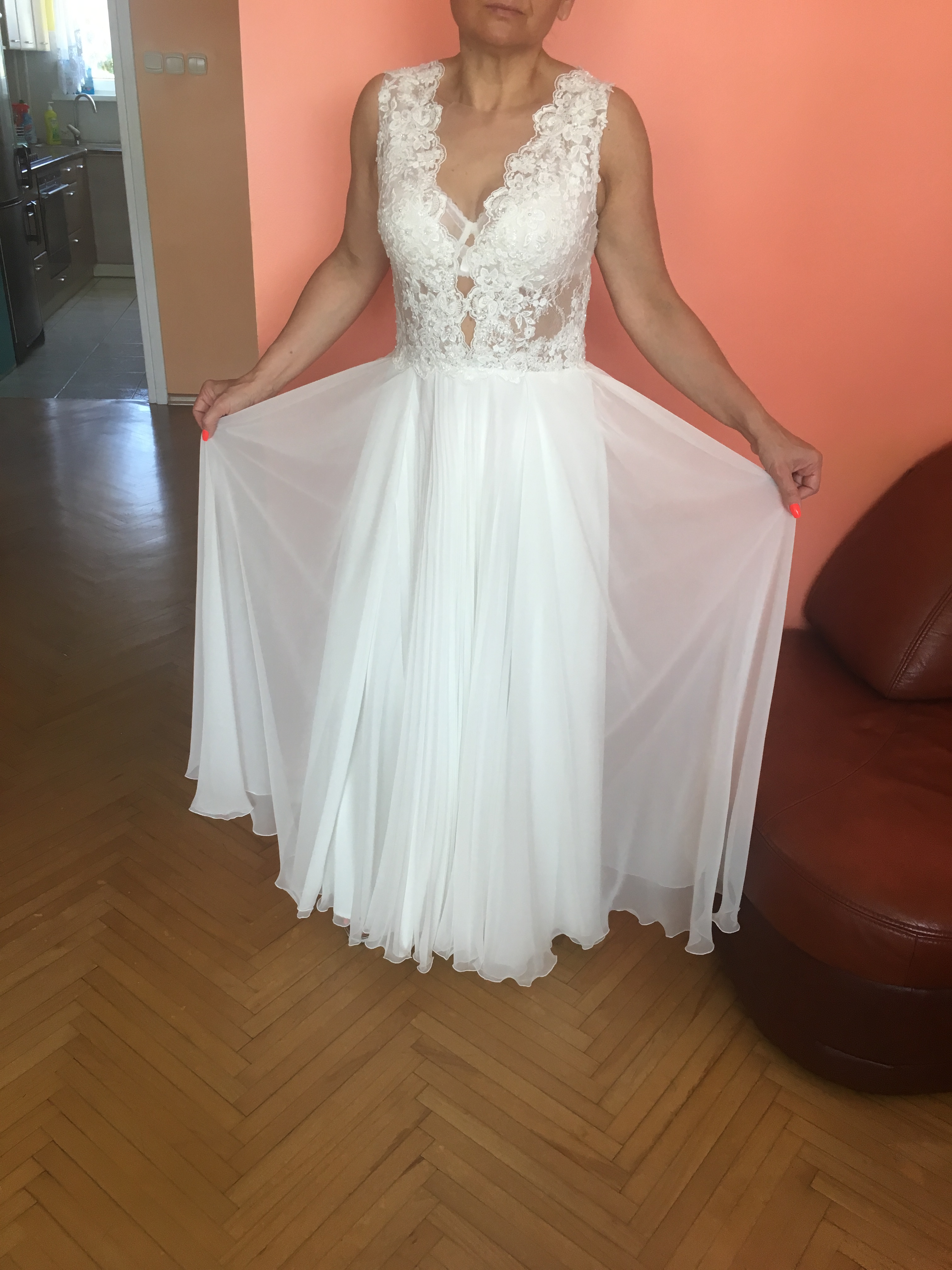 Witam mam do sprzedania przepiękną sukienkę ślubną model Diana firmy Emmi Mariage z kolekcji 2018. Sukienka jest bardzo lekka, delikatna, subtelna z ciekawym dekoltem. Góra sukienki bogato zdobiona, dół z plisą. Sukienka w salonie kosztowała 3800 złoty. Ubrana na chwilę na ceremonię do Urzędu Stanu Cywilnego. Sukienka jest w stanie idealnym, jak z salonu. Rozmiar sukienki 38, wzrost 164 plus 4 cm obcas. Serdecznie zachęcam bo sukienka w rzeczywistości prezentuje się wspaniale.