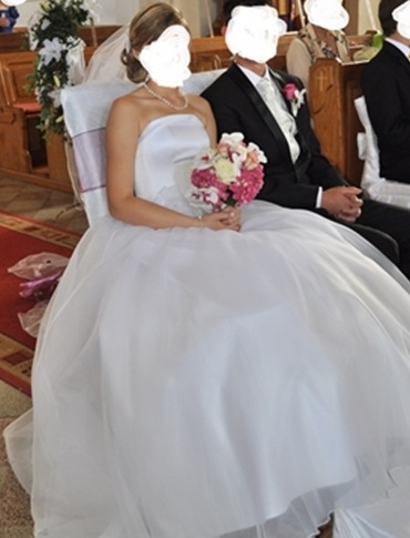 Mam do sprzedania śliczną sukienkę zakupioną w salonie firmowym Agnes w Gdyni z kolekcji Platinum model 10605. Suknia jednoczęściowa w kształcie litery A zapinana z tyłu w kolorze białym góra z satyny dół z organtyny szyta na wzrost 167 + 9 cm obcas , obw. biustu 88 cm, pod biustem 75 cm, obw. tali 70 cm, obw. bioder 94 cm. Założona tylko raz w dniu ślubu nie jest zniszczona i została wyprana w profesjonalnej pralni.