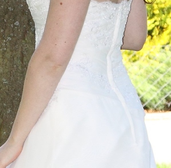 Piekna jednoczesciowa suknia Mori Lee 4210, rozmiar 38/40, idealna dla wzrostu 174cm + obcasy ok 10 cm. Gorna czesc sukni posiada wbudowany gorset pokryty koronka z delikatnymi krysztalkami i perelkami, gorset zakonczony jest ksztaltem serca na piersiach i przedluzony warstwa koronki wysoko pod szyje (zapiecie koronkowej obreczy- na szyi z tylu, delikatnymi guziczkami).Dolna czesc sukni ( ksztalt litery A) to jednolita warstwa satyny z wierzchnia warstwa delikatnego szyfonu (asymetrycznie drapowany na biodrze, pokryty fragmentami koronki z krysztalkami i perelkami). Suknia z litery A przechodzi ku tylowi w sredniej dlugosci tren (na zakonczeniu trenu pod spodem jest satynowa tasiemka ktora umozliwi Tobie przewieszenie trenu przez reke podczas tanca (dodaje uroku!). Calosc zapinana z tylu na zamek (calkowicie zakryty zakladka z materialu).Suknia od wewnatrz posiada gumowy szeroki pas, ktory zapiety uwidoczni doskonale Twoja talie oraz utrzyma caly ciezar sukni na biodrach (poczujesz duzy komfort! Sprawdzone).Jesli chcesz wygladac olsniewajaco i niepowtarzalnie, to suknia dla Ciebie. Jest piekna i elegancka. Suknia nowa, ubrana tylko raz, wyczyszczona profesjonalnie w zakladzie chemicznym. Suknia jest wolna od dymu papierosowego!