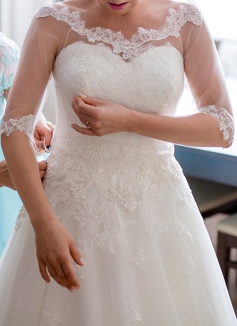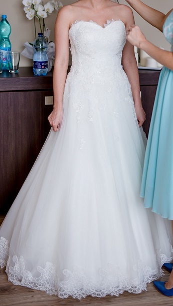 - suknia wykończona jest koronką u dołu.