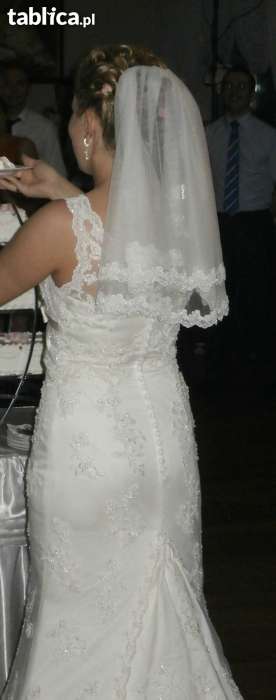 Suknia koloru Ivory (złamana biel, jednak nie jest to ecru), cała wyszywana jest koralikami Svarowskiego oraz hiszpańską koronką, pięknie błyszczy się w słońcu. Pod biustem posiada tasiemkę z kokardką, która podkreśla biust. Suknia posiada kilku warstwowy, podwiązywany tren! (Istnieje oczywiście możliwość "odpięcia" oraz "dopięcia" trenów.).