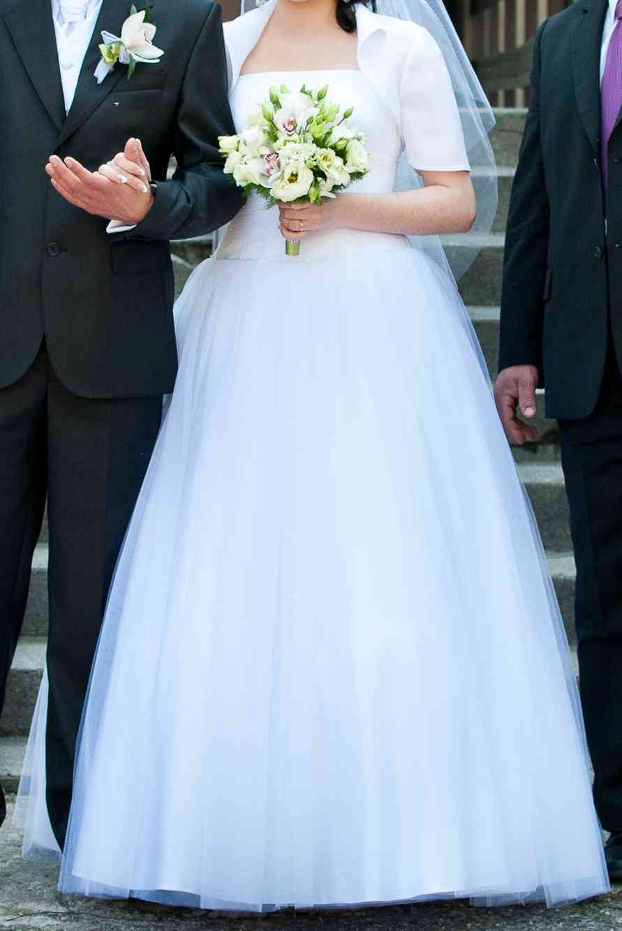 Suknia uszyta z śnieżnobiałego tiulu przez co jest lekka,jednoczęściowa.
