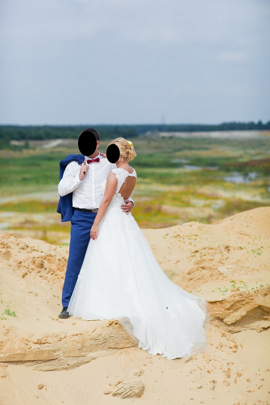 Piękna suknia w kolorze śmietankowej bieli szyta na wzór Cosmobella 7701. Zmienione są jedynie ramiączka, żeby lepiej się trzymały (w oryginale były cienkie i wżynające się pod pachami), z odkrytymi plecami obszytymi koronką. Suknia posiada tren zapinany na guzik. Jest ona po czyszczeniu i renowacji, do zestawu dodaję halkę na kole.
