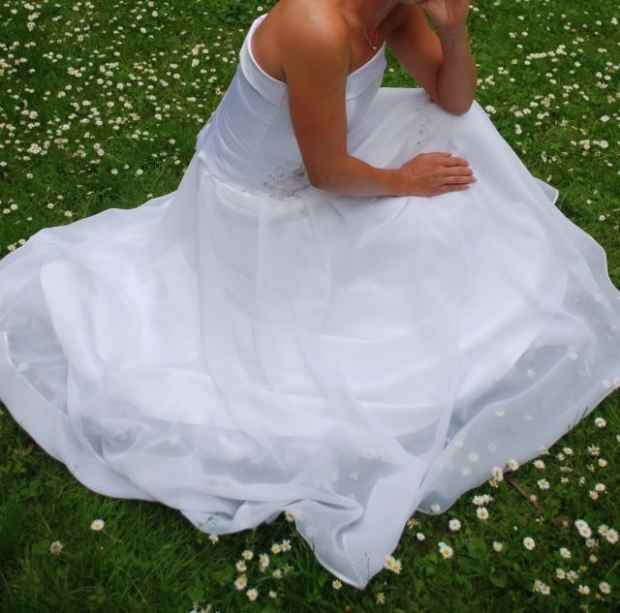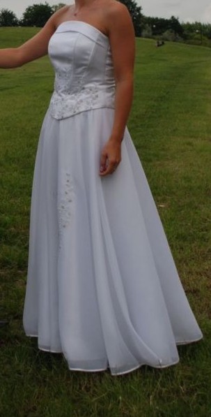 Suknia jest dwuczęściowa, uszyta z satyny z delikatną kwiatową aplikacją z gipiury. Gorset bez ramiączek, zapinany na zamek z dodatkowym ozdobnym wiązaniem na sznurek; ładnie modeluje biust. Spódnica z warstwą organtyny na wierzchu, co nadaje jej lekkości i zwiewności. Całość wygląda skromnie, ale elegancko i ładnie modeluje sylwetkę. Jeśli szukasz sukni wygodnej, bez zbędnych udziwnień, falbanek, która tuszuje drobne niedoskonałości i sprawi, że w tym wyjątkowym dniu będziesz się czuła pięknie i komfortowo, to koniecznie przyjrzyj się tej sukni!!!