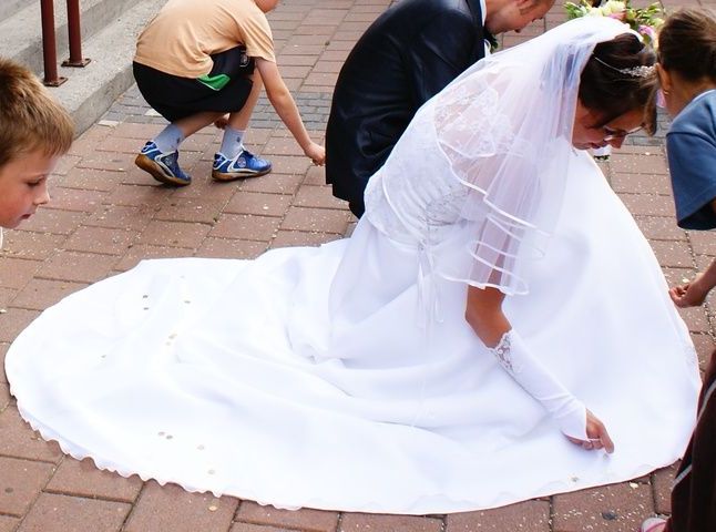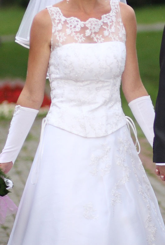 Suknia założona raz, bardzo wygodna, po weselu poddana czyszczeniu chemicznemu.