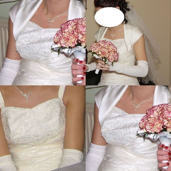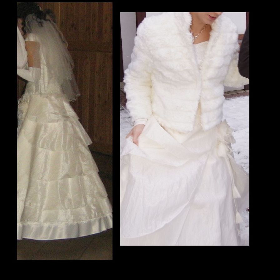 Rozmiar sukienki na metce 38- ale posiada regulację z tyłu więc może być śmiało na szczuplejszą osobę. Sukienka była prana. Kupiłam ją nową więc zalożona tylko raz. Nie jest zniszczona. Do sukienki dodaję welon i rękawiczki widoczne na zdjęciach. Istnieje też możliwość dorzucenia bolerka i kożuszka za drobną dopłatą- myślę że się dogadamy:)