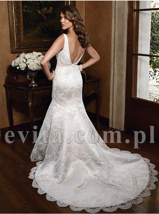 Sukienka podkreśla kształty, eksponuje plecy, jest wyszywana kryształkami, które pięknie mienią się w świetle. Jest bardzo wygodna, posiada koronkowy podpinany tren.