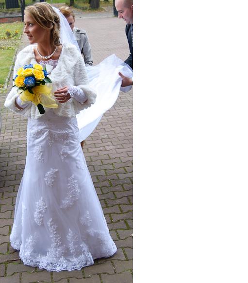 Pieknie zdobiona, w cenie caly komplet tj bolerko, welon krotki, dlugi oraz rekawiczki.