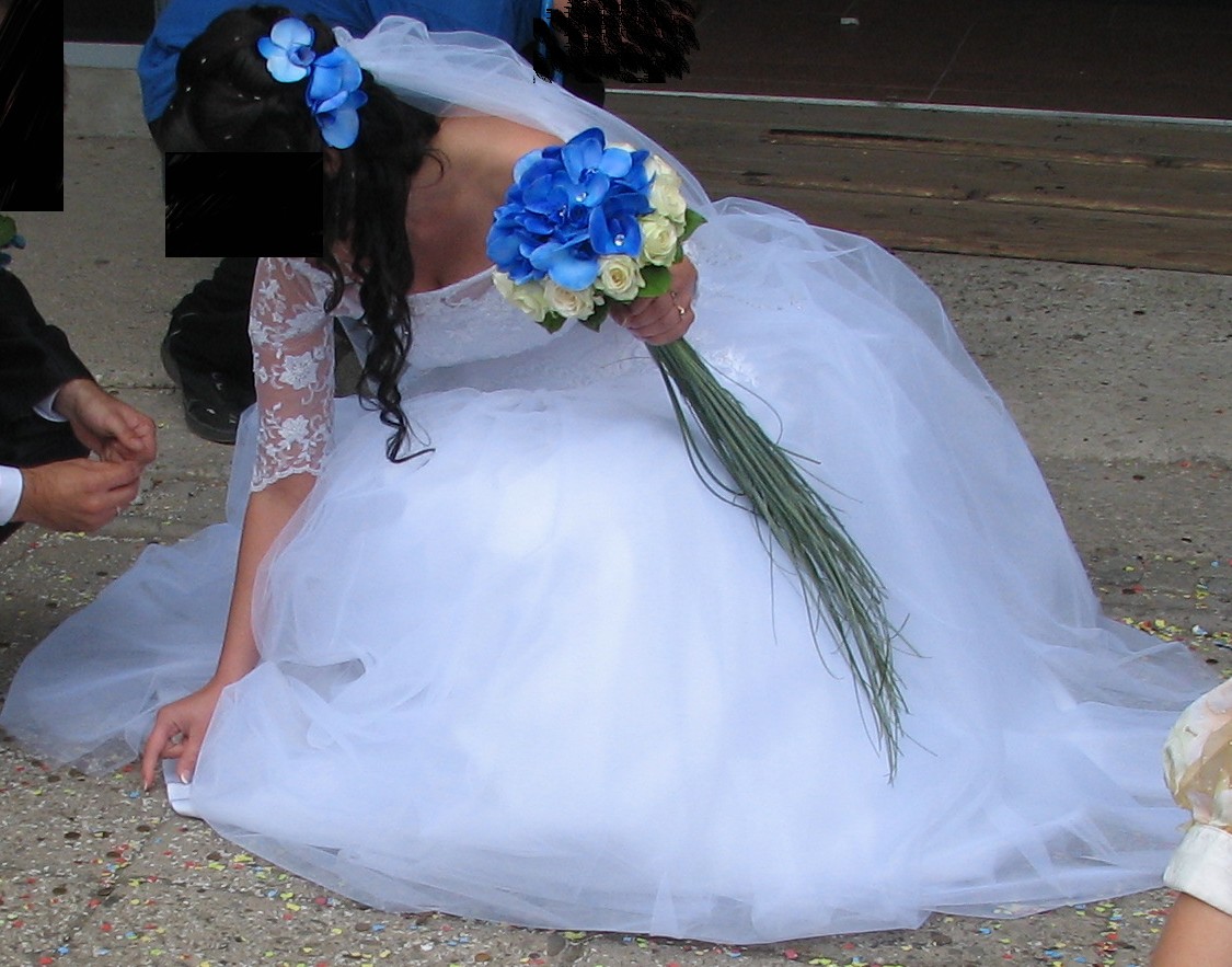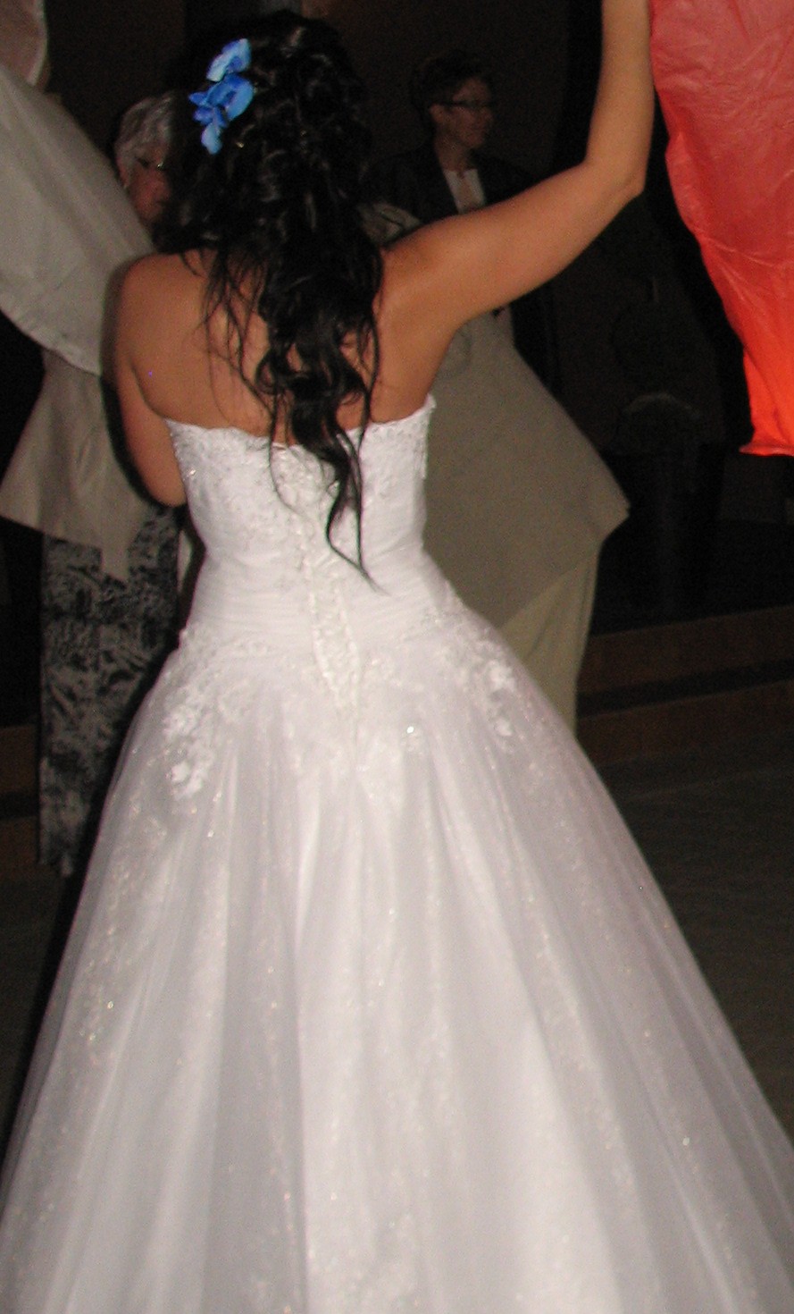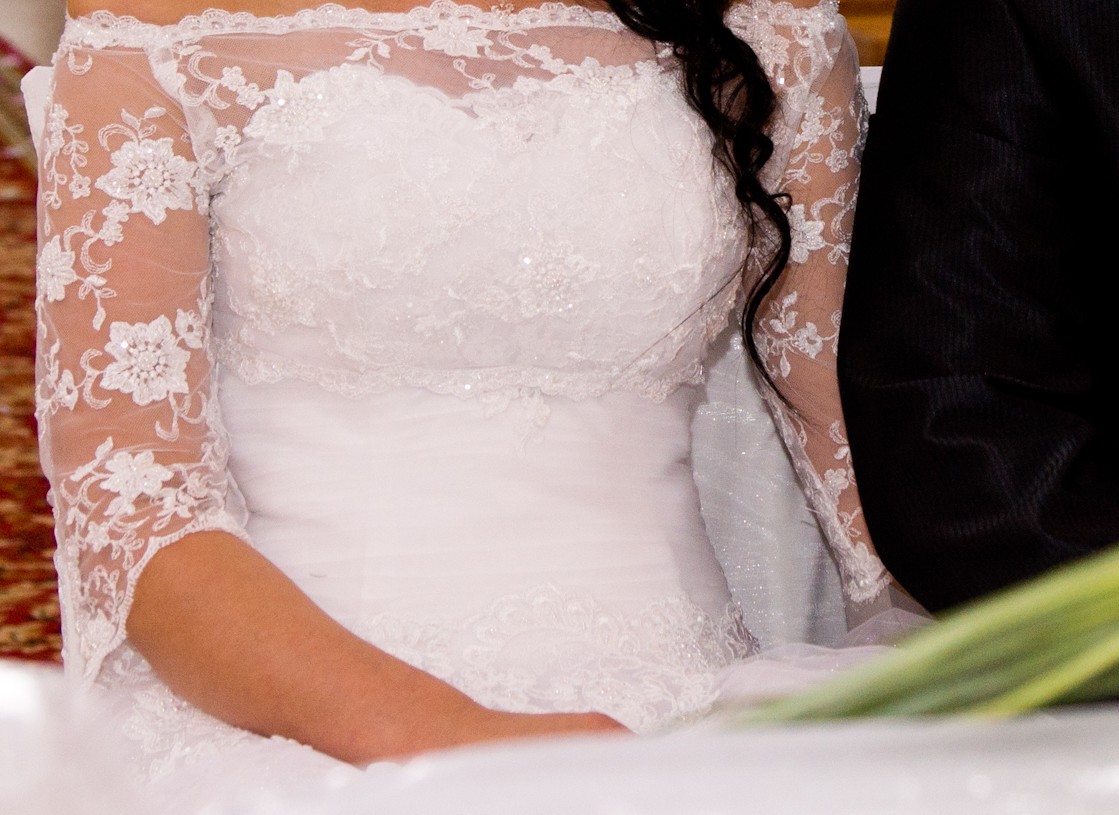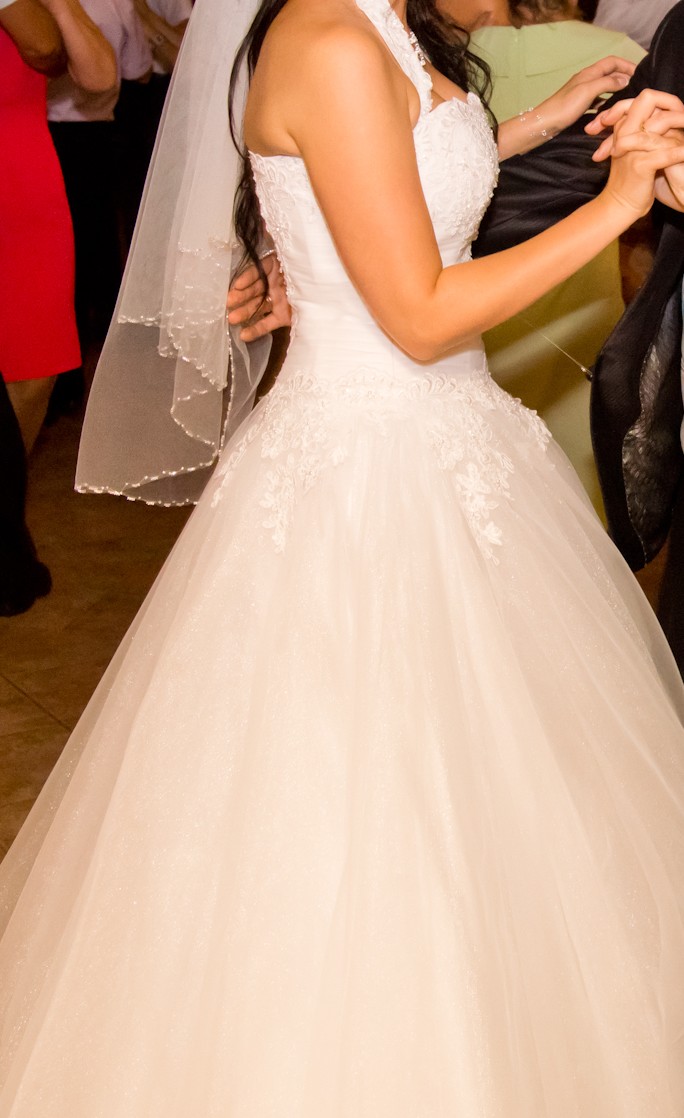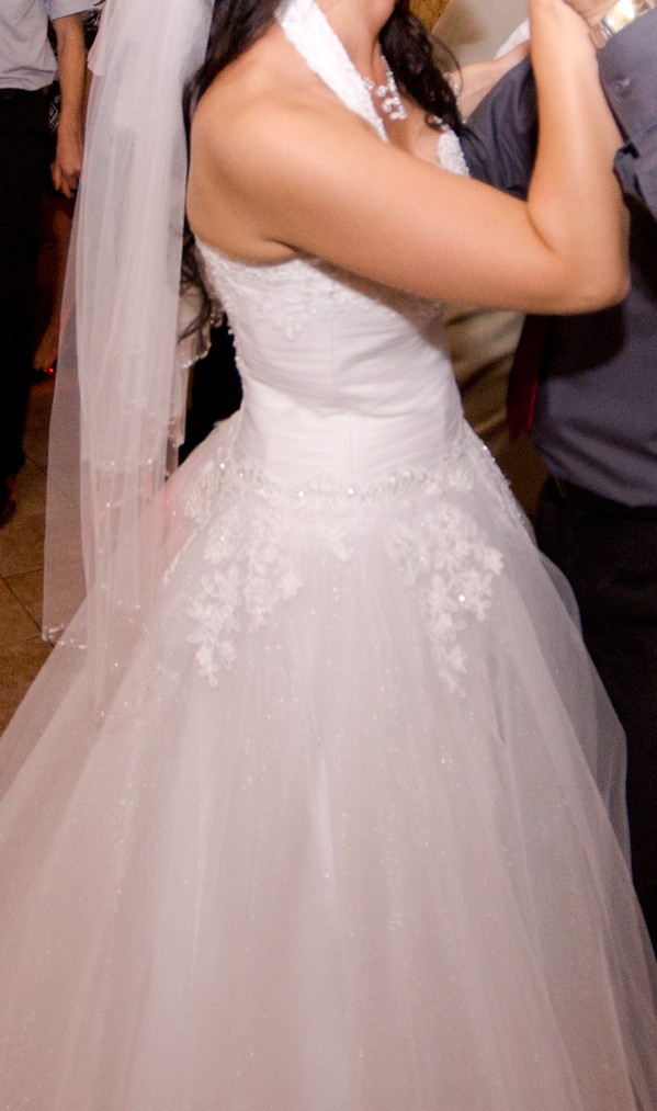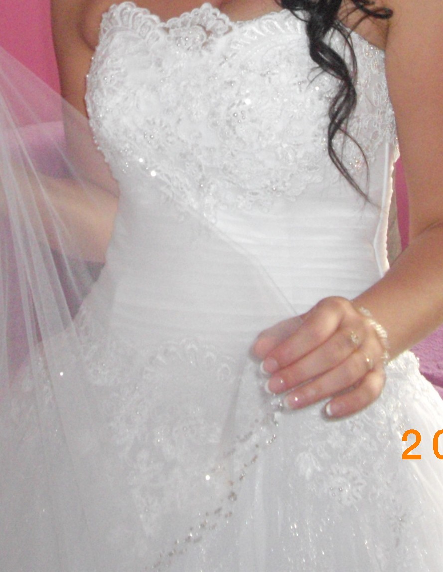 Suknia ślubna biała, zakupiona na sierpień 2013 w salonie Fasson w Paniówkach, z kolekcji Princessa, model Vivian. Dół sukni obszyty trzema warstwami tiulu, dekolt w serce zdobiony kryształkami. Była szyta na miarę, ale będzie pasowała na panią, która nosi rozmiar 36 (suknia jest wiązania z tyłu). Gratis do sukni mogę dodać koronkowe bolerko, które jest widoczne na zdjęciach i z którym suknia prezentuje się jeszcze piękniej, również rozmiar 36. Suknia posiada również szerokie ramiączka zapinane na szyję, które są ładnym dodatkiem, ale także dają pewność, że suknia nam się nie zsunie ;-) mimo, że nie powinna i takie zapewnienia dawano mi w salonie, poprosiłam jednak o doszycie, bo poprostu takie mi się podobały ;-) ale można bez żadnego uszczerbu dla sukni pozbyć się ich lub po prostu schować (gdy np zakładamy bolerko). Możliwość przeróbki w salonie Fasson.