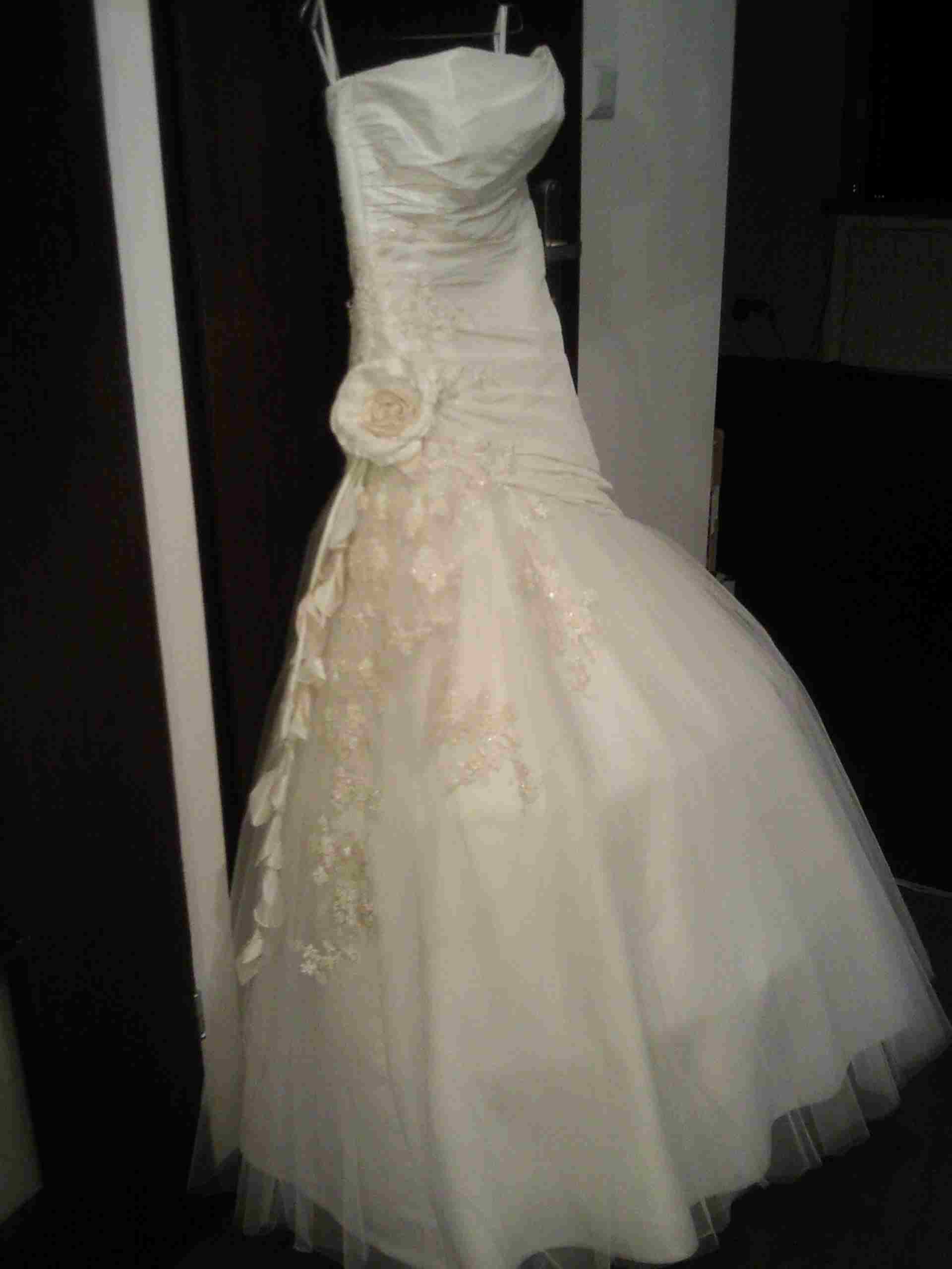 Suknia w kolorze ecru zapinana na zamek. Tiul na dole sukni jest poszarpany- niestety rozerwał się przy tańczeniu ponieważ obcasy miałam za niskie, suknia jest dość długa więc istnieje możliwość obcięcia tiulu. Do kompletu: kolo, bolerko z długim rękawem, ewentualnie welon (niestety przerabiany przed weselem dlatego nadaje się tylko pod np.kok tak żeby nie było widać mocowania welonu) oraz naszyjnik z perełek- oczywiście imitacja + kolczyki. Suknię trzeba oddać do pralni.