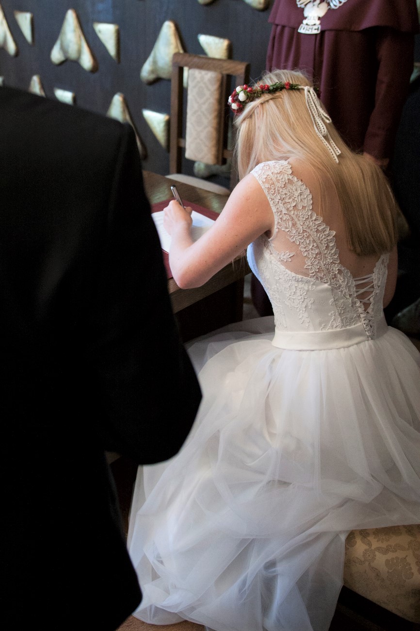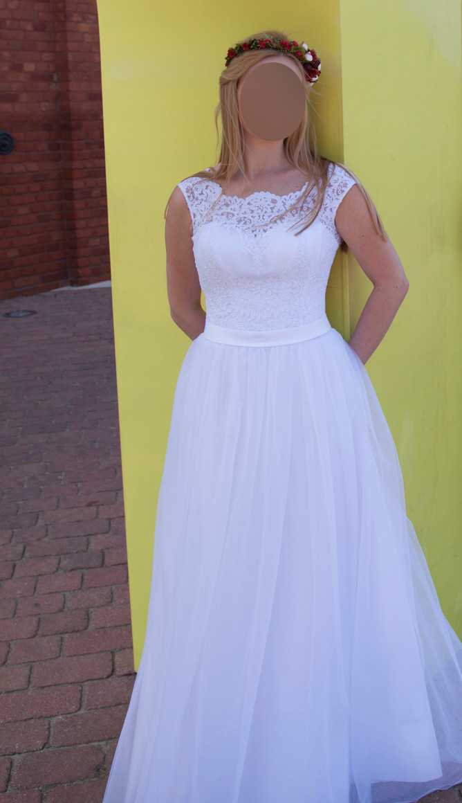 Mam do sprzedania piękną, delikatną suknię ślubną w kolorze białym. Jestem pierwszą właścicielką. Góra sukni uszyta jest na wiązanie, a gorset wzmocniony fiszbinami (wszyte miseczki push–up). Suknia wykonana jest z prześlicznej koronki, natomiast dół z delikatnego, zwiewnego tiulu (2 warstwy), który podszyty jest halką (bez koła). Rozmiar sukni to 38. Będzie pasować idealnie na Pannę Młodą o wymiarach: biust 88 - 92, talia 70 – 76. Przy wzroście 170 cm + 9 cm obcas – zakrywa buty. Niestety nie ma możliwości przymiarki. Mogę przesłać więcej zdjęć.