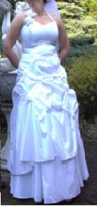 Sprzedam piękną suknię ślubną z białej tafty, jednoczęściową z wiązanym gorsetem i ramiączkiem na szyję. Suknia jest w rozmiarze 40/42 i na 166 cm wzrostu + obcas 6cm. Suknia jest lekka i pięknie się prezentuje. W komplecie welon i bolerko.