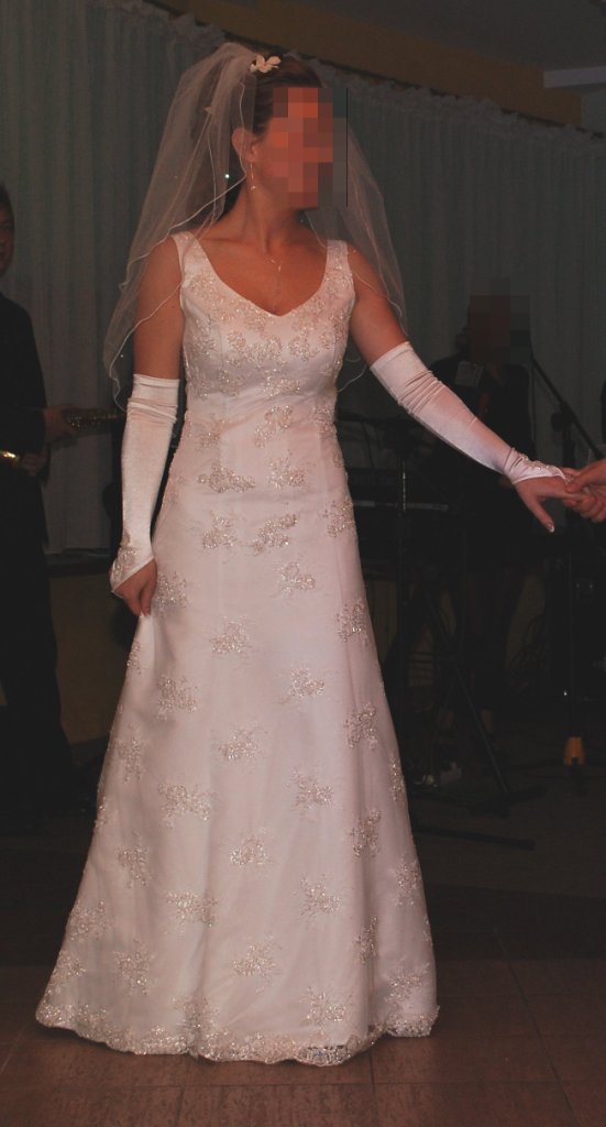 Sprzedam białą suknię, szytą z całości, na ramiączkach, z naszytą białą koronką ze srebrą nitką, która efektownie się mieni. Suknia w kształcie A, z niewielkich trenem podpinanym na guziczki. Dekolt w szpic, ładnie podkreśla dekolt Z tyłu wycięta, wiązana. Cena w salonie 2500, stan b. dobry.
