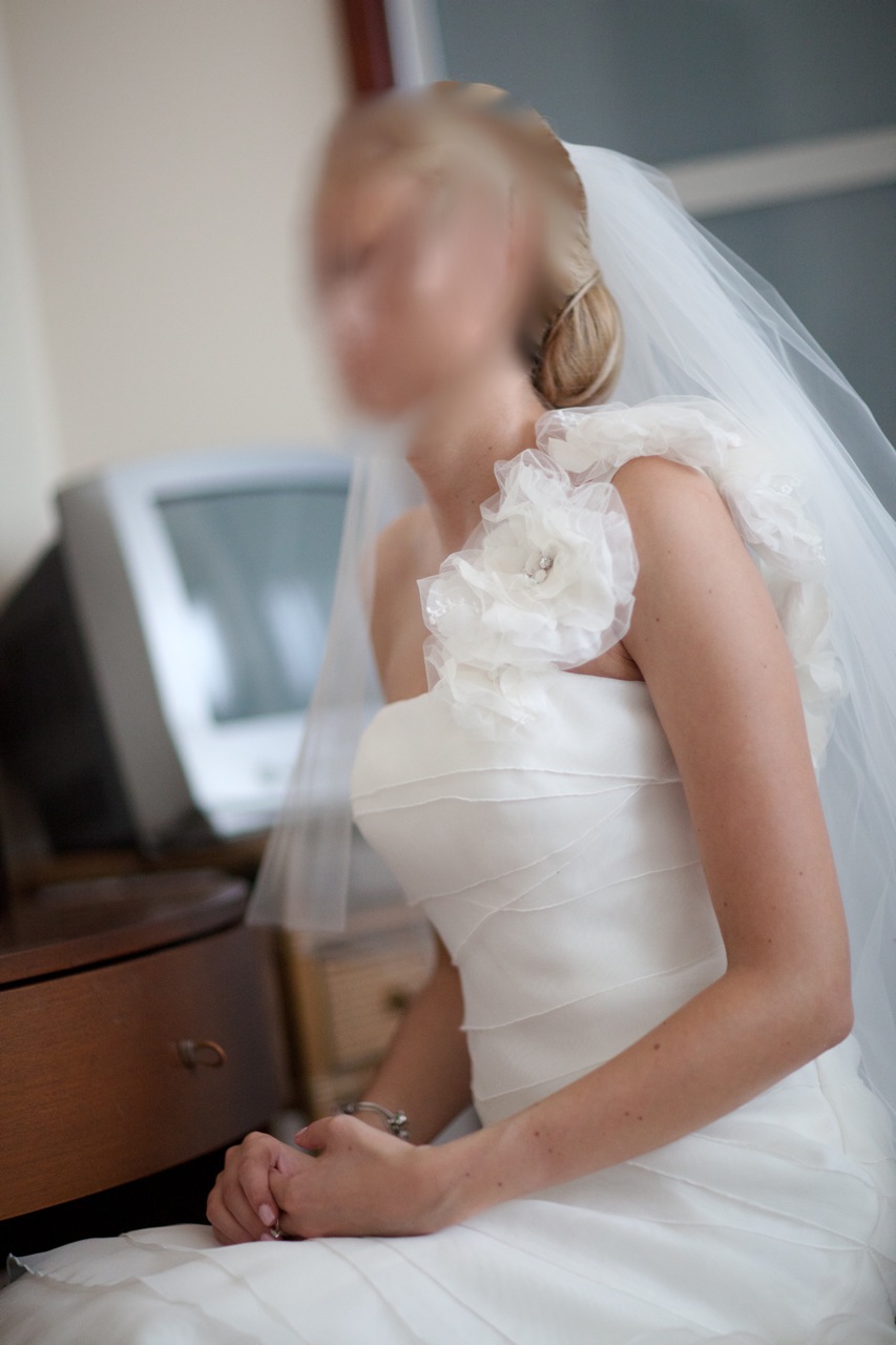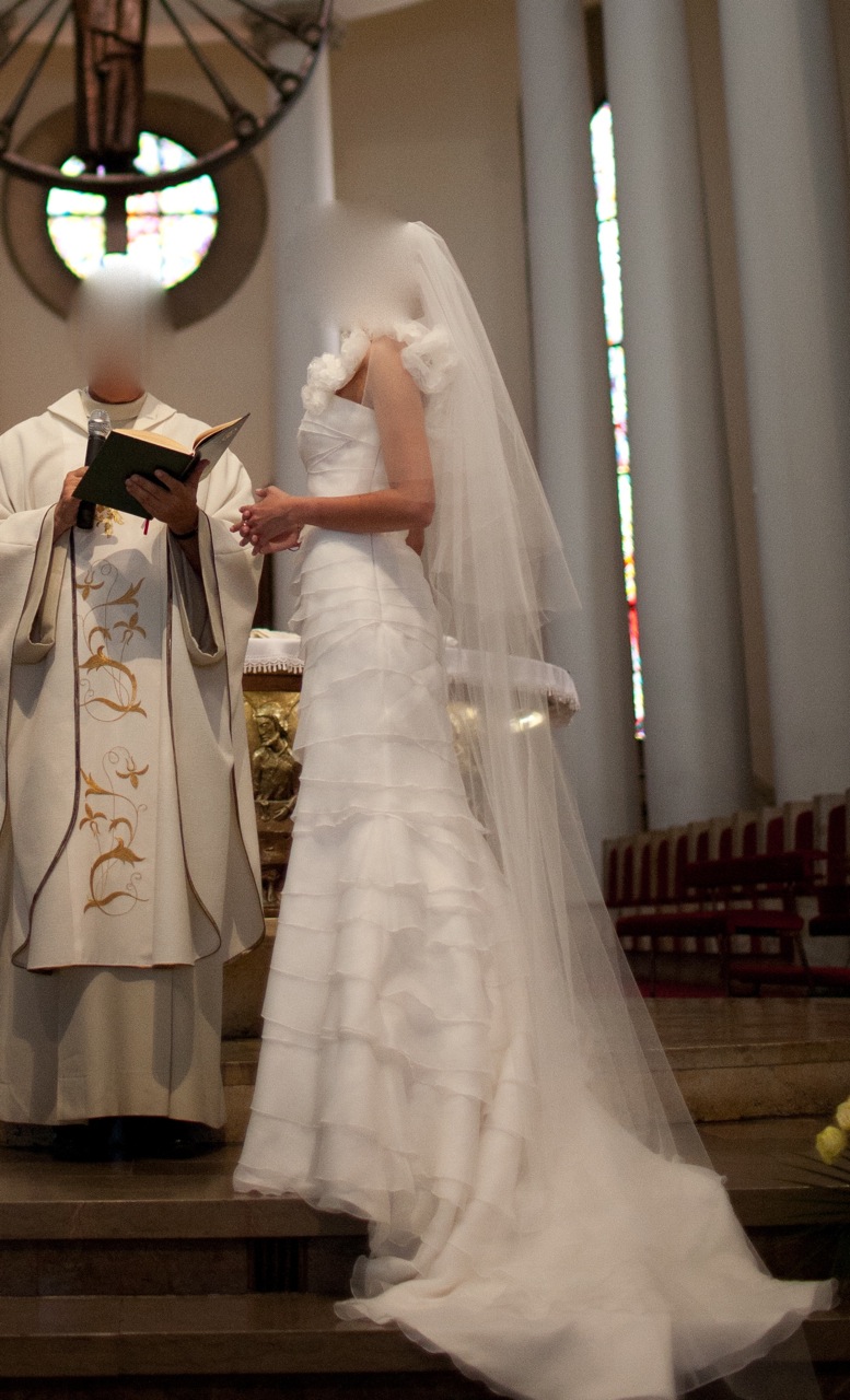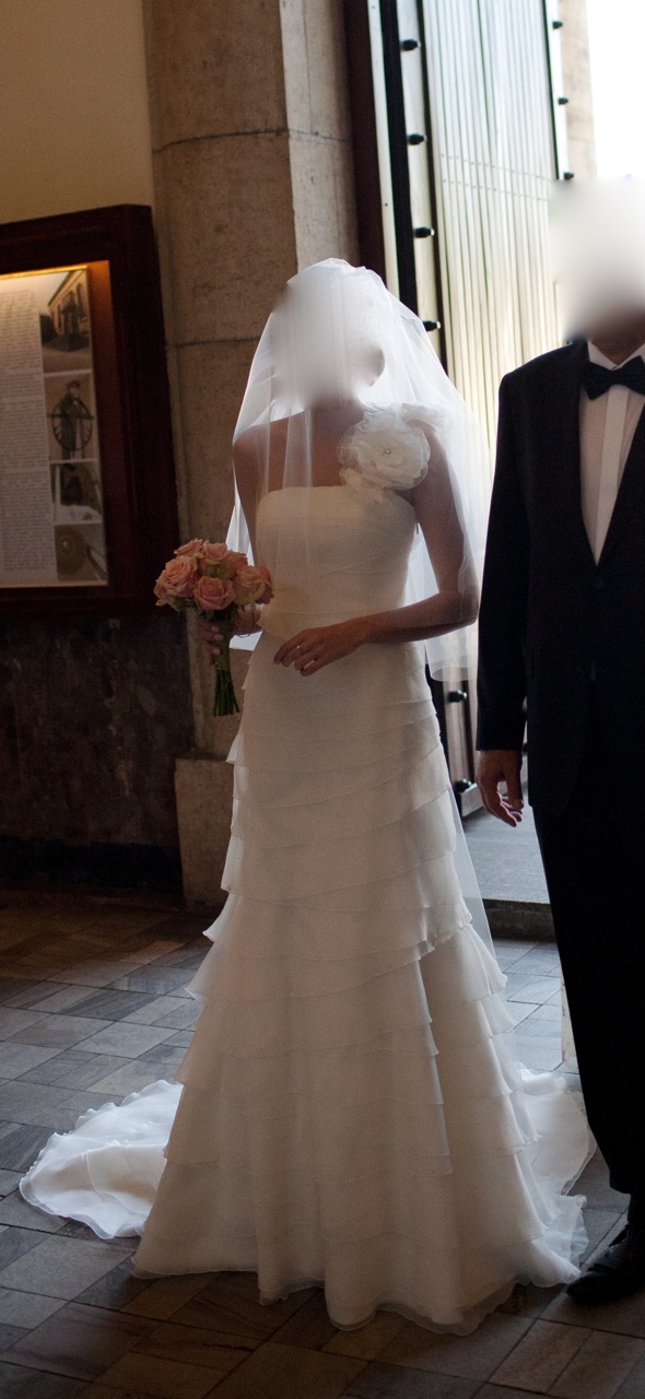 Suknia kupiona w salonie firmowym Madonna w Katowicach (ul.Kopernika) w sierpniu 2011. Bardzo ładna, ciekawy efekt tworzy charakterystyczne ramiączko z kwiatów. Długa, ściśle dopasowana do ciała - podkreśla kobiecą sylwetkę. Sukienka w kolorze kości słoniowej. Stan bardzo dobry, po czyszczeniu. Rozmiar 36-34. Cena za którą nabyłam suknię to 4200PLN.