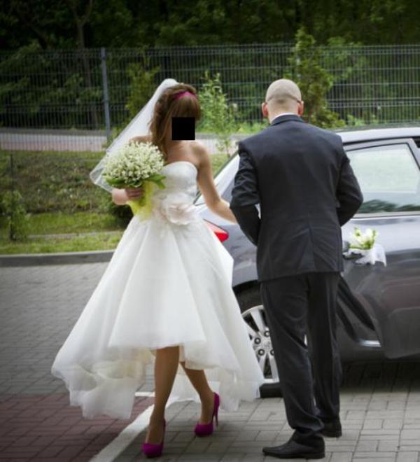 Suknia jest używana, szyta na krój litery A, do tego z bardzo oryginalnym cięciem – z przodu krótka, z tyłu długa. Suknia w kolorze IVORY (bardzo subtelny kolor między bielą a ecru) z podpinanym trenem. Do sukni cudownie pasuje atłasowy, pudrowo - różowy pas z kwiatem jabłoni (dokładnie taki jak na zdjęciu), który również dodaję.