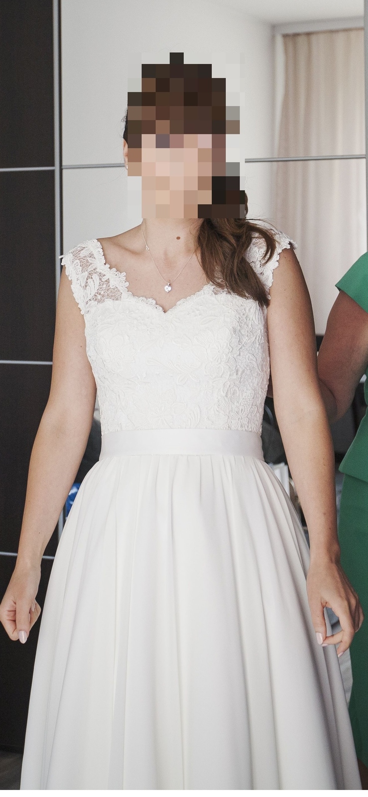 Sprzedam suknię ślubną w kolorze ecru. Suknia w rozmiarze 36 na wzrost 160 cm + 9 cm obcas. Góra z koronki , z tyłu urocza subtelna mała kokarda, zapięcie na zamek ukryty pod guziczkami. Dół wielowarstwowy, zewnętrzna warstwa z muślinu. Dodatkiem do sukni jest usztywniona halka. Suknia bardzo wygodna, zwiewna i lekka. Stan bardzo dobry, bez uszkodzeń. Osoby zainteresowane zapraszam do kontaktu.