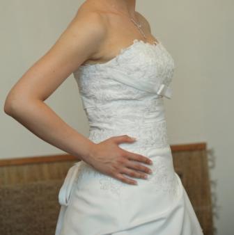 Sprzedam satynową suknię ślubną w kolorze białym, jednoczęściową w kształcie litery A. Gorset sukni ozdobiony jest haftem z koralikami oraz uroczą kokardką. Tył sukni jest sznurowany, dzięki czemu suknia bardzo dobrze trzyma się ciała, dopasowuje do sylwetki i można ją swobodnie regulować. Suknia została uszyta w salonie sukien ślubnych Jola Moda, jest to model Ksenia i została założona tylko jeden raz. Do sukni dołączona jest osobno zakładana halka uszyta z tiulu na kole. Halka od góry ma wszyty materiał z lycry i bardzo dobrze dopasowuje się pod suknią. Suknia jest w rozmiarze 38, uszyta na 167 cm wzrostu + 6 cm obcas. Suknia jest po profesjonalnym czyszczeniu chemicznym. Do sukni dodatkowo dołączam: bolerko, welon (długość około 75 cm), rękawiczki (nieużywane), a nawet nowe nieużywane pończochy samonośne. Wszystko w kolorze białym i zabezpieczone w pokrowcu.