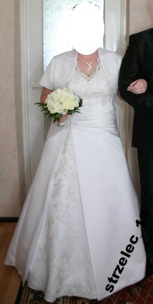 Mam do sprzedania prześliczną suknię ślubną model Greta zakupiona w salonie. Kolor biały, materiał satyna, rozmiar 46, zapinana na zamek z tyłu. Z przodu oraz na rozcięciu od pasa przyozdobiona licznymi srebnymi dodatkami. Z przodu efektowne rozcięcie. Całość bardzo ładnie układa się w trakcie chodzenia i tańca. Suknia bardzo wygodna, stan bardzo dobry, cena w salonie 2500zł. Do sukni dołączam GRATIS bolerko tej samej firmy i welon. Możliwość wysłania większej ilości zdjęć sukni na e-mail. Kontakt: z.tomek@wp.pl tel. 663-985-028