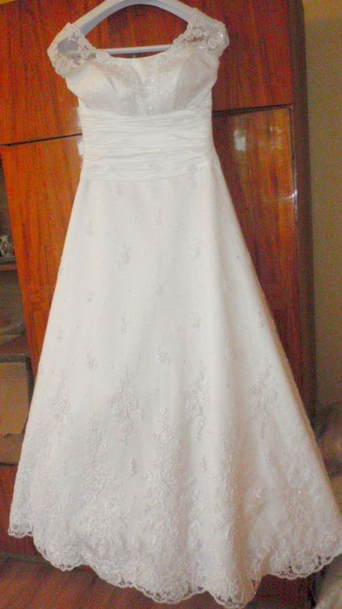 Oferuję suknię ślubną, która została zakupiona przeze mnie w grudniu 2012 roku w salonie sukien ślubnych Sarah w Rybniku. Suknia nie została jednak przeze mnie założona do ślubu w lipcu, ponieważ wybrałam i kupiłam inną suknię (spodobał mi się inny fason sukni, który lepiej pasuje do mnie) Suknia którą oferuję jest więc nowa, śnieżnobiała, styl klasyczny, użyty materiał to tiul, koronka i atlas. Posiada szerokie ramiona które są ładnie zdobione koronką i nadają sukni elegancji. z tylu jest wiązana na gorset co pozwala dopasowac do figury każdej kobiety.