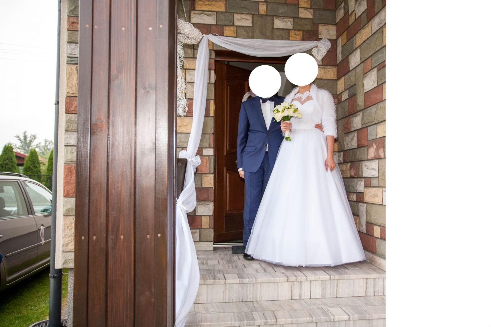 Suknia koloru białego, rozmiar 36-38, szyta na wzrost 170 cm + 4 cm obcas. Istnieje możliwość skrócenia.