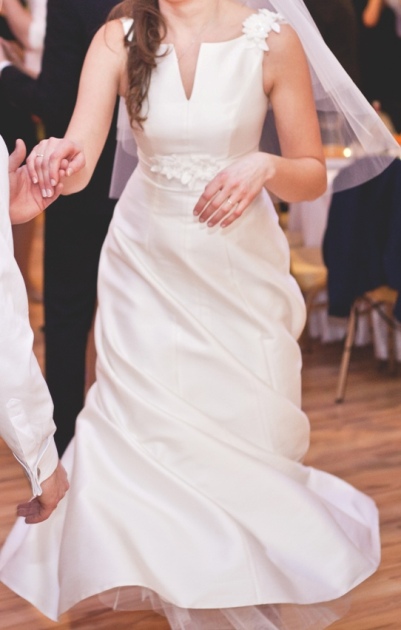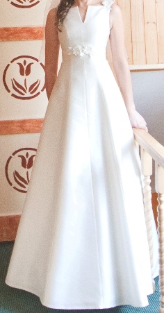 Skromna i delikatna, wykonana tak zwanym cięciem francuskim, które dodaje elegancji każdej osobie, tuszuje ewentualne niedoskonałości sylwetki, bardzo wyszczupla. Posiada dodatkowo halkę z kołem dzięki której pięknie się układa. Na prawdę polecam - wygodna i komfortowa. Szczególnie dla osoby wysokiej - kupiona na 178cm wzrostu. Przepięknie układa się w każdej pozycji - w tańcu, siedząc, klęcząc, można w niej poczuć się na prawdę po królewsku :) Polecam!
