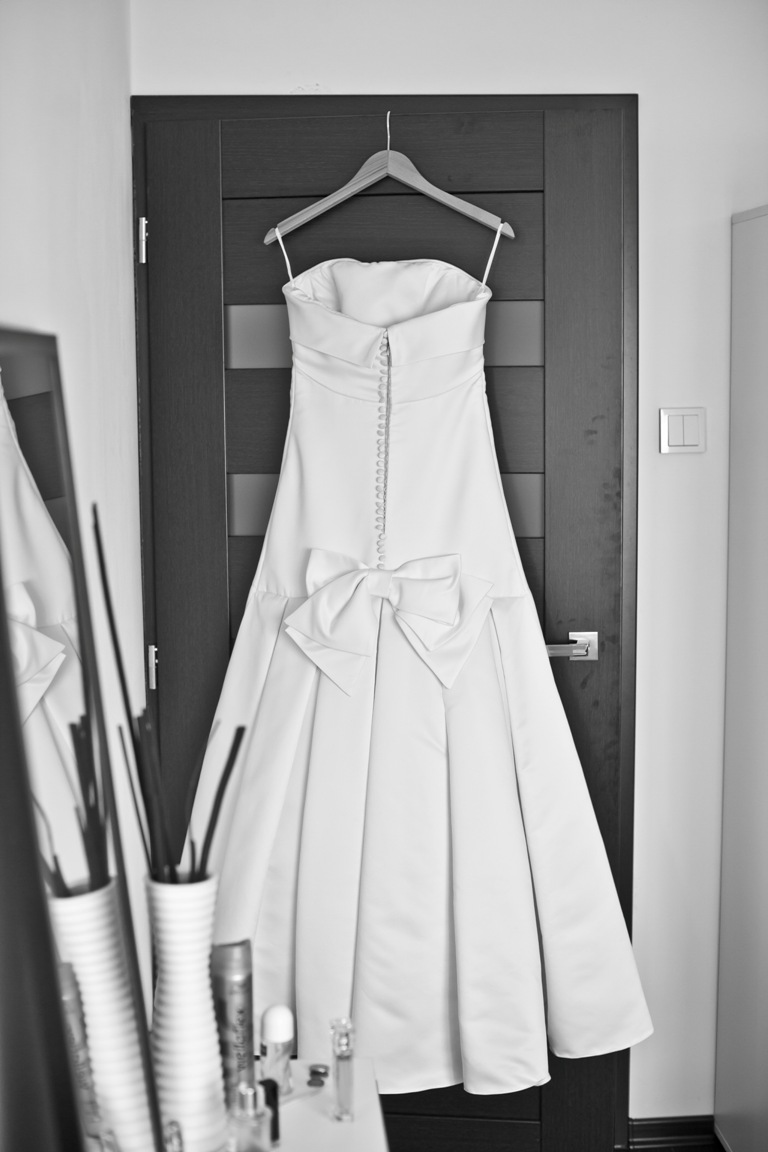 Z przodu, jest gładka, z zakładką na piersiach. Z tyłu są małe guziki i kokarda od której wychodzi plisowany bardzo efektowny tren, który ślicznie się układa dzięki wszytym usztywniaczom.