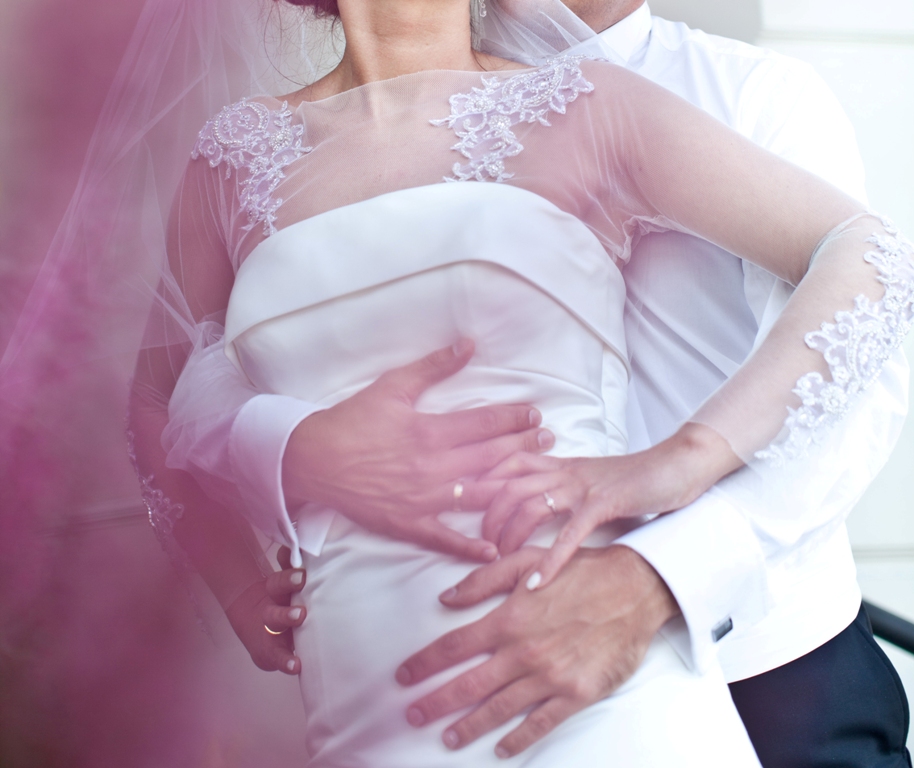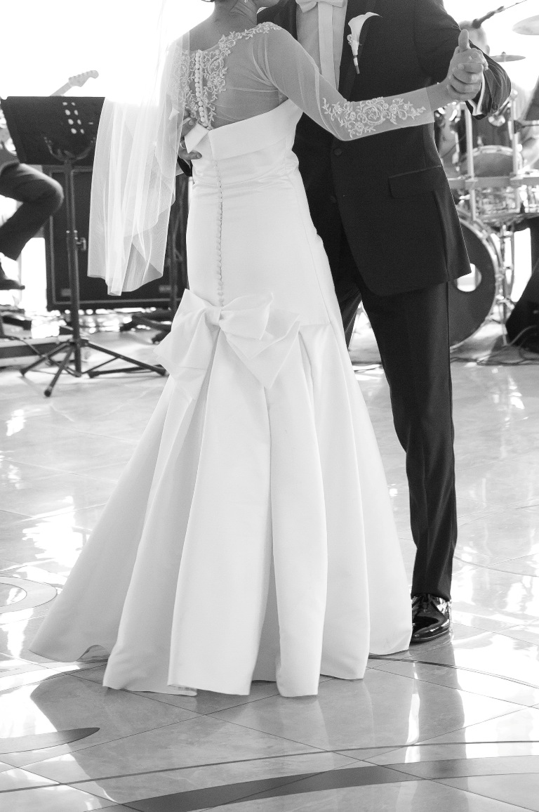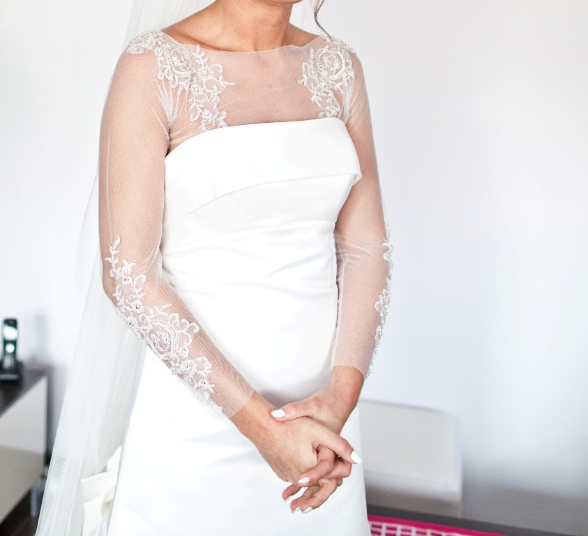 Do sukni na specjalne zamówienie zostało uszyte boler ko na którym naszyte są aplikacje. Po ubraniu bolerka mamy efekt jakby tworzyło z suknią całość. Po ceremonii kościelnej bolerko można zdjąć.
