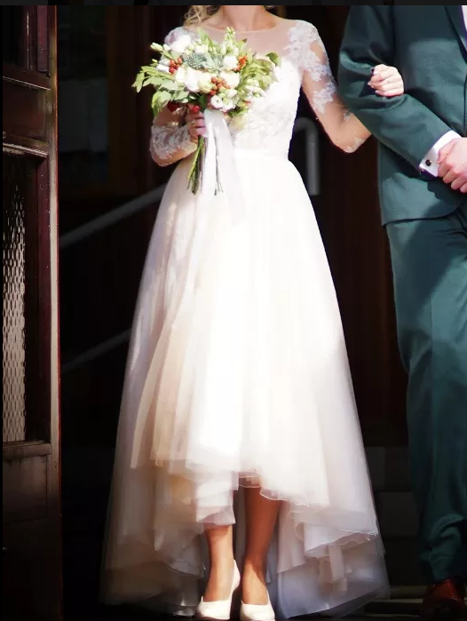 Suknia ślubna z salonu AMY LOVE to niepowtarzalne połączenie sukni Nela i Lauri. Suknia w kolorze śmietankowym z warstwą w kolorze nude. Zapinana na suwak, który idealnie wtapia się w suknię. Wewnątrz wszyte miseczki zastępujące stanik. Suknia z przodu sięga do połowy łydki, z tyłu całkiem długa. Suknia w stanie idealnym, nie miałam dodatkowego pleneru po ślubie.