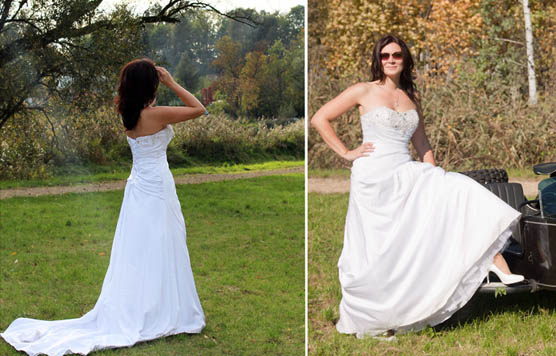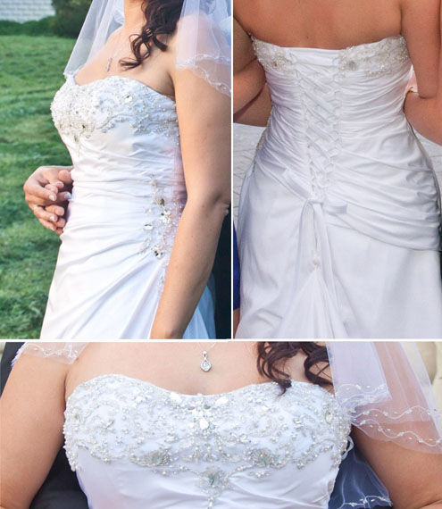 Suknia jest jednoczęściowa z satyny, kolor śnieżna biel. Długi tren podpinany na dwa razy. Uszyta na wymiary 95-75-105, wzrost 177 + 5cm obcas. Górna część sukni oraz lewy bok w kryształkach i perełkach + delikatne marszczenia na całej długości z przodu. Z tyłu sukni wiązanie gorsetowe, dzięki czemu istnieje możliwość dopasować do innych wymiarów.
