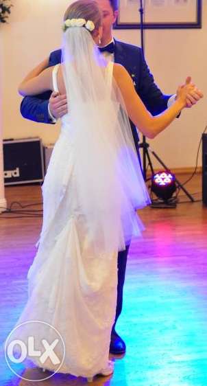 Sprzedam przepiękną suknię ślubną marki Cymbeline model Femea/Emea. Suknia na wzrost 165 cm (ja mam 160 cm dlatego suknia nie była do samej ziemi, więc na niższą osobę będzie bez problemu pasować). Wymiary: biust: 85 cm, talia 65 cm, biodra 90 cm. Noszę rozmiar 36/38. Suknia ma rozmiar francuskie 40. Byla zwężana w biuście. Można poszerzyć w tym miejscu. Suknia zapinana na zamek. Tren podpinany. Suknia wyczyszczona, stan bardzo dobry, koronka w paru miejscach lekko naderwana, ale nie jest to widoczne pośród tylu warstw koronki. Gratis dodaję buty rozmiar 38 (stan gorszy ale dodaję gratis) oraz welon typu mgiełka, 100 cm długości, dwuwarstwowy. Suknia w pokrowcu.