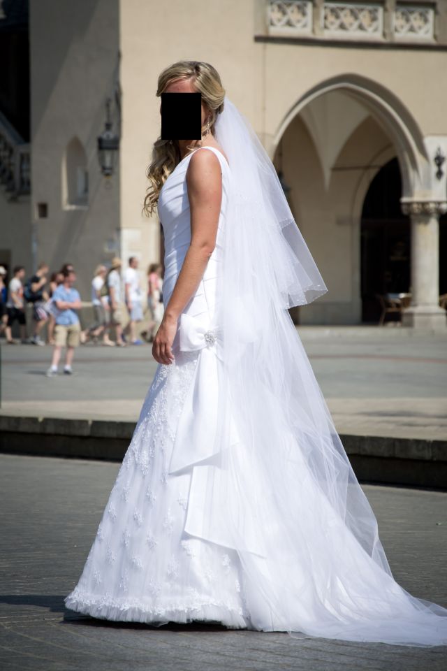 WITAM PRZYSZŁE PANIE MŁODE!!!!!! :-) Mam do sprzedania sudną suknię ślubną . Suknia posiada tren ok 0,5m, tren ściągany do góry, który nie będzie przeszkadzał podczas tańca. ( nie posiada guzików które mogły by się oderwać !) Do zakupionej sukni dorzucam welon długości 2,5m. - jak widać na zdjęciu. Po uroczystości ślubnej welon można bezproblemu wypiąć i naprzykład zostawić drugi krótki (tak ja miałam:) super się sprawdziło! ). Suknia na wysokość ok 166cm plus 10 cm obcas. Suknia na zamek dla Pań które noszą rozmiar S lub M (36/38), z boku ozdobna kokarda, która pięknie wypełnia całokształt sukni. Suknie można obejrzeć w Tycach, Katowicach, Mikołowie i okolicach..... Naprawdę polecam.... :P Pozdrawiam przyszłe Panie Młode, naprawde to wyjątkowy dzień dla wyjątkowej sukni!!!!!!!