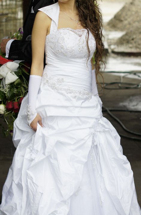 Sprzedam jednoczęściową suknię ślubną wraz z rękawiczkami (bez bolerka) szytą na wzór Sary z 2001 r, a dół z modelu 1005 bez kanty. Zakupiona w salonie Afrodyta 2010 roku. Suknia wykonana z tafty, udekorowana licznymi, srebrnymi ozdobami.