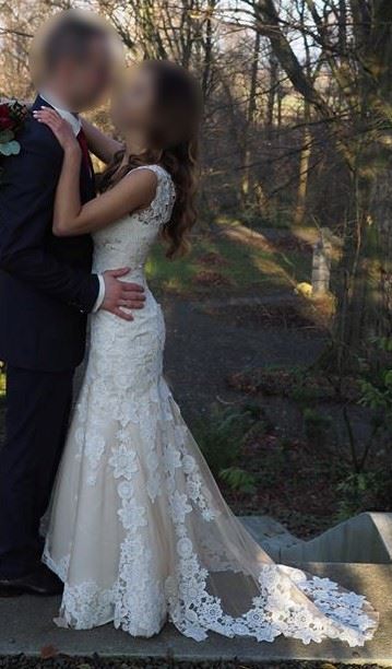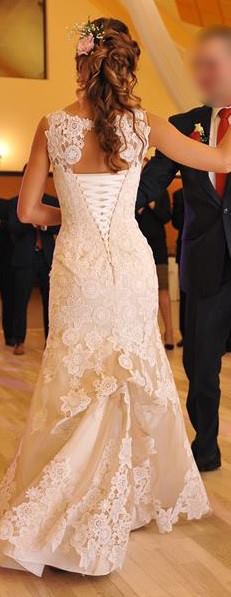 sprzedam suknie ślubną w kolorze ecru o fasonie syreny z trenem (możliwość podpięcia trenu).
