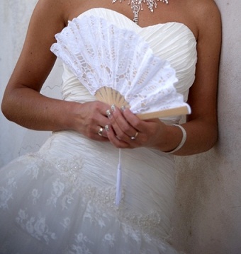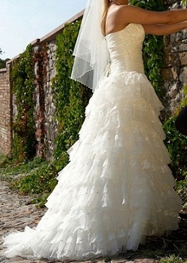 Sukienka była zakupiona w renomowanym, firmowym salonie Cymbeline, gdzie znajdują się jedynie modele z markowych kolekcji. Model pochodzi z kolekcji 2009 i jest rzadko spotykany (znalazłam w jednym salonie). Dodatkowo na moje życzenie krój sukni został przerobiony, co sprawia, że jest jedyna w swoim rodzaju. Został skrócony stan, żeby nie przypominał kroju „rybki” (widać na zamieszczonych zdjęciach). Góra wykonana jest z karbowanej satyny z tyłu sznurowana, co umożliwia dopasowanie do figury, nie posiada ramiączek. Całą ozdobę stanowią falbanki z trzech różnych materiałów, w tym koronki, ułożonych w lekki skos. Suknia posiada niewielki tren, który można podpiąć. Górną część sukienki od spódnicy oddzielają ozdobne cekiny dodające sukni elegancji i szyku. Do sukni dokładam welon i halkę (na dwóch fiszbinach) gratis.