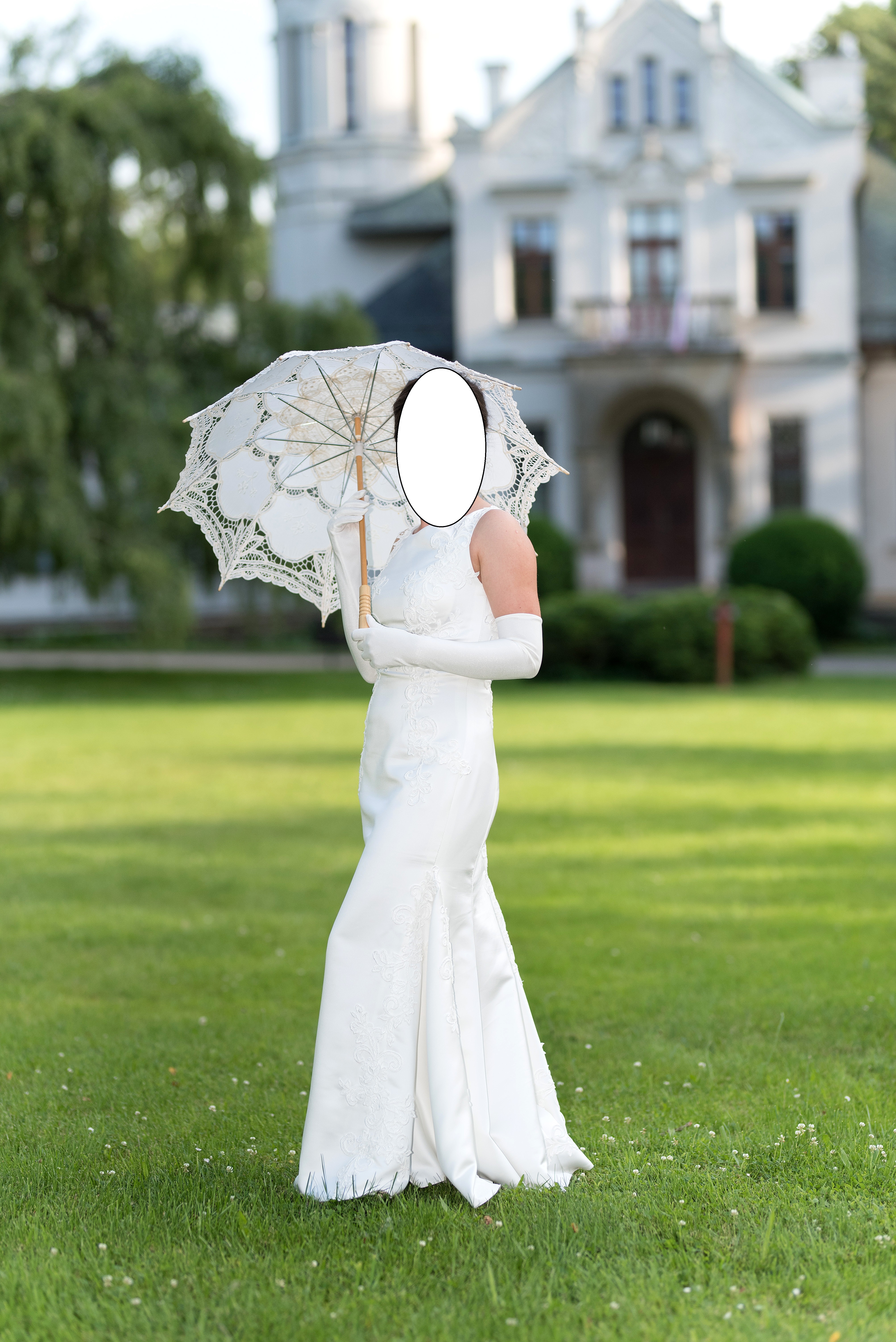 Piękna suknia ślubna zakupiona w salonie w kolorze ivory. Wymiary: wysokość 160 cm + 9 cm obcasy, biust 62 (wszyte wkładki), talia 73, biodra 97. Suknia uszyta jest z satyny, posiada odkryte pięknie zdobione plecy zabudowane cielistą siateczką. Suknia ozdobiona jest koronką. Do sukni dołączę długi welon, dwuwarstwowy, toczek w kształcie kokardy oraz długie rękawice.