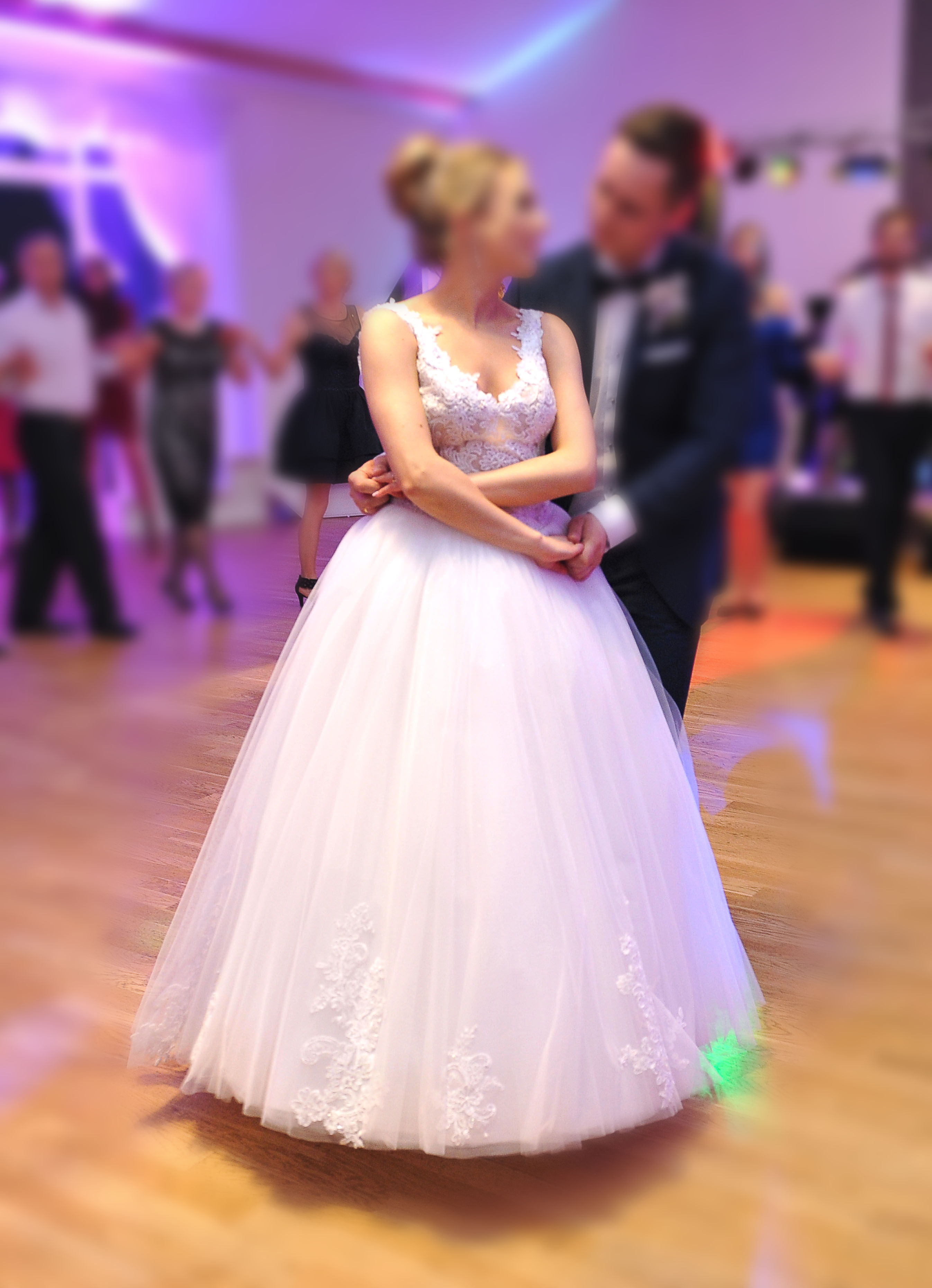 Suknia jest w idealnym stanie. Unikalna ponieważ szyta u doświadczonej krawcowej. Suknia jest śnieżnobiała. Gorset uszyty jest z koronki z dodatkami drobnych perełek, zakończony tasiemką z cyrkoniami. Dół sukni jest wykonany z kilku warstw tiulu podszytego brokatowym materiałem, co daję efekt delikatnego mienienia się, szczególnie w tańcu. Na zewnętrzny tiul naszyte są aplikację z koronki (naprzemiennie większe i mniejsze). Suknia jest uszyta na rozmiar 36/38, wzrost 164. W skład sukni wchodzą również dwa welony. Długi (do kościoła), z naszytymi aplikacjami z koronki, oraz krótki zakończony delikatnym obszyciem, przeznaczony na wesele.