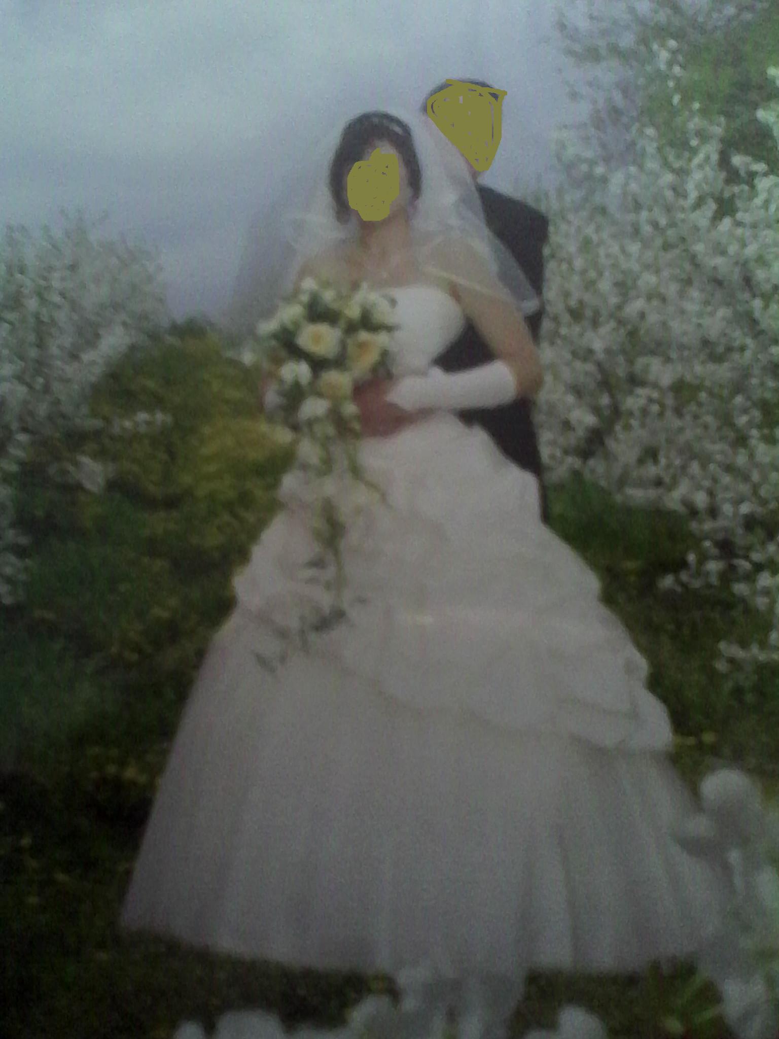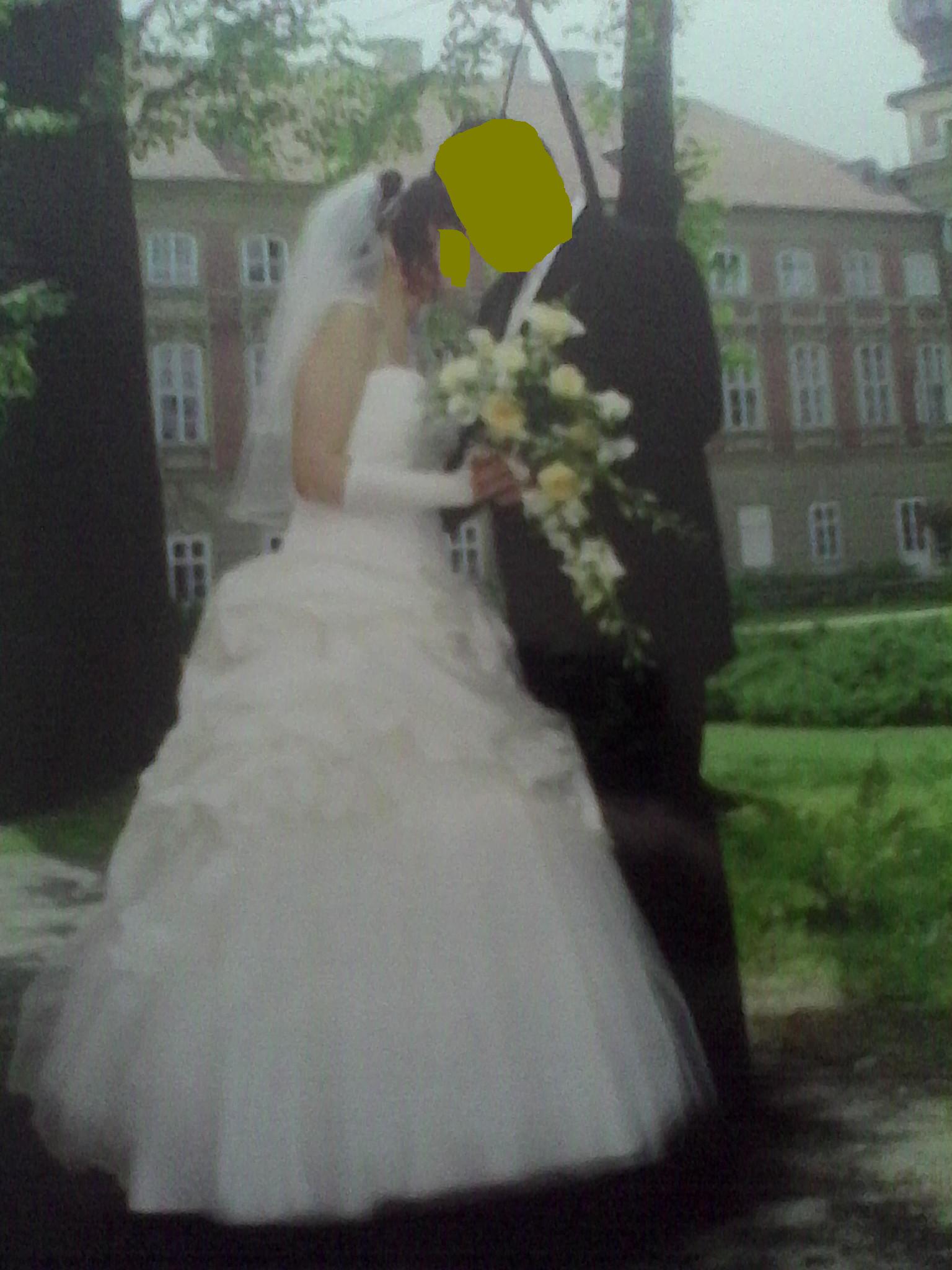 Suknia ślubna typu "princessa", w rozmiarze 38, zakupiona na Ukrainie, na wzrost 168+5 cm. obcas. Kolor waniliowy. Uszyta z tafty oraz tiulu, którego jedna warstwa jest obsypana połyskującym brokatem. Gorset z tyłu posiada regulację. Halka na kole o najszerszej z możliwych objętości jest zakładana osobno.Suknia nie posiada trenu, ramiączek ani bolerka. Welon i rękawiczki widoczne na fotografiach gratis.