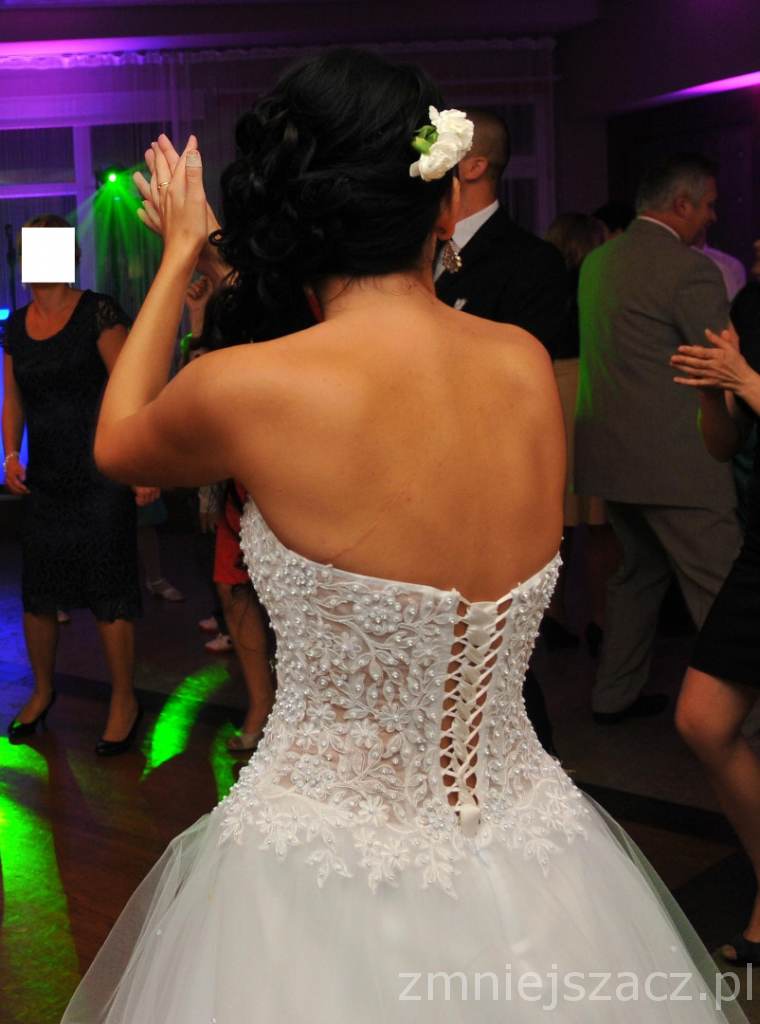 Witam do sprzedania mam suknie ślubną w kolorze śnieżno białej bieli.Suknia jest jednoczęściowa, szyta na miarę na wzrost 165cm + obcasy, dół sukni wykonany z kilku warstw tiulu, jedna warstwa jest cała w brokacie dzięki temu suknia pięknie się mieni. Gorset jest cały zdobiony kryształkami, tył gorsetu jest wiązany( co daje możliwość go powiększenia lub pomniejszenia) i prześwitujący co daje przepiękny efekt. Niestety zdjęcia nie oddają idealnie całego uroku tej sukni, ale z całą pewnością poświadczam że watro! jest naprawdę śliczna...Bardzo wygodna,dobrze układająca się podczas tańca. Do Sukni jest komin z tiulu.
