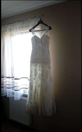 * Suknia typu trąbka/ syrenka ( od końca dłoni rozszerza się) z ozdobną górą wykonaną z koronki oraz zdobiona kryształkami. Koronka prezentuje się przepięknie na plecach.