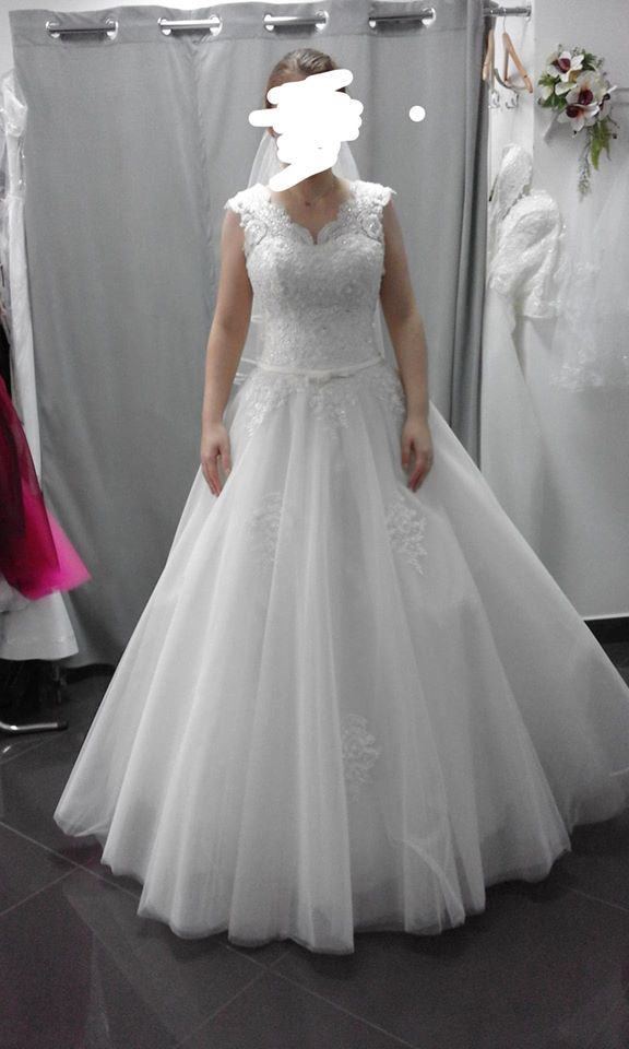 Sprzedam piękną suknię ślubną model Emilia 2018 w kolorze écru rozmiar 36/ 38. Suknia jest bogato zdobiona na górze migoczącymi kamykami, na szerszych ramiączkach, dół zaś składa się z wszytego koła i siedmiu warstw tiulu układających się w literę A. Dekolt jest w V a plecy pięknie wycięte, zapinana z tyłu na zamek oraz ozdobne sznurowanie, w tali jest pasek z kokardką. Suknia dopasowana na wzrost 162+7cm obcas Bardzo wygodna i elegancka, pięknie podkreśla talie i biust. Suknia uprana w profesjonalnej pralni, dokonano poprawek po użytkowaniu. Możliwość wysłania większej ilości zdjęć. Posiadam również pasujący welon.