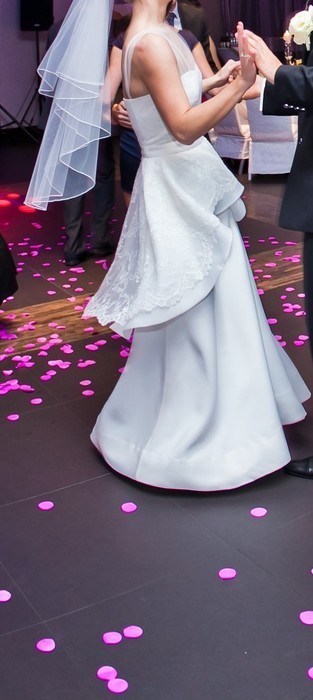 Z oczywistych względów założona raz mruga suknia czysta, oddana do prania w salonie ślubnym, bez zaciągnięć, plam i wad.
