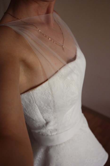 Piękna suknia ślubna, szyta na miarę (rozmiar 36, 170cm wzrostu + obcas) w pracowni krawieckiej - szycie profesjonalne (pracownia zajmuje się szyciem kostiumów np do teatrów). Suknia uszyta z mlecznej organzy na podszewce, baskinka to warstwa organzy oraz miękkiej francuskiej koronki chantilly. Gorset lekko sztywny, obszyty koronką. Z przodu przeciągnięta delikatna mgiełka schodząca się z tyłu w ramiączka (sukienka ma również wszyte ramiączka dla większej pewności - ja ich nie używalam, w gorset wszyty jest zapinany pas, który trzyma suknię). Nie miałam halki, tym bardziej koła - suknia pięknie się bez nich układa, ale jeśli ktoś się uprze..
