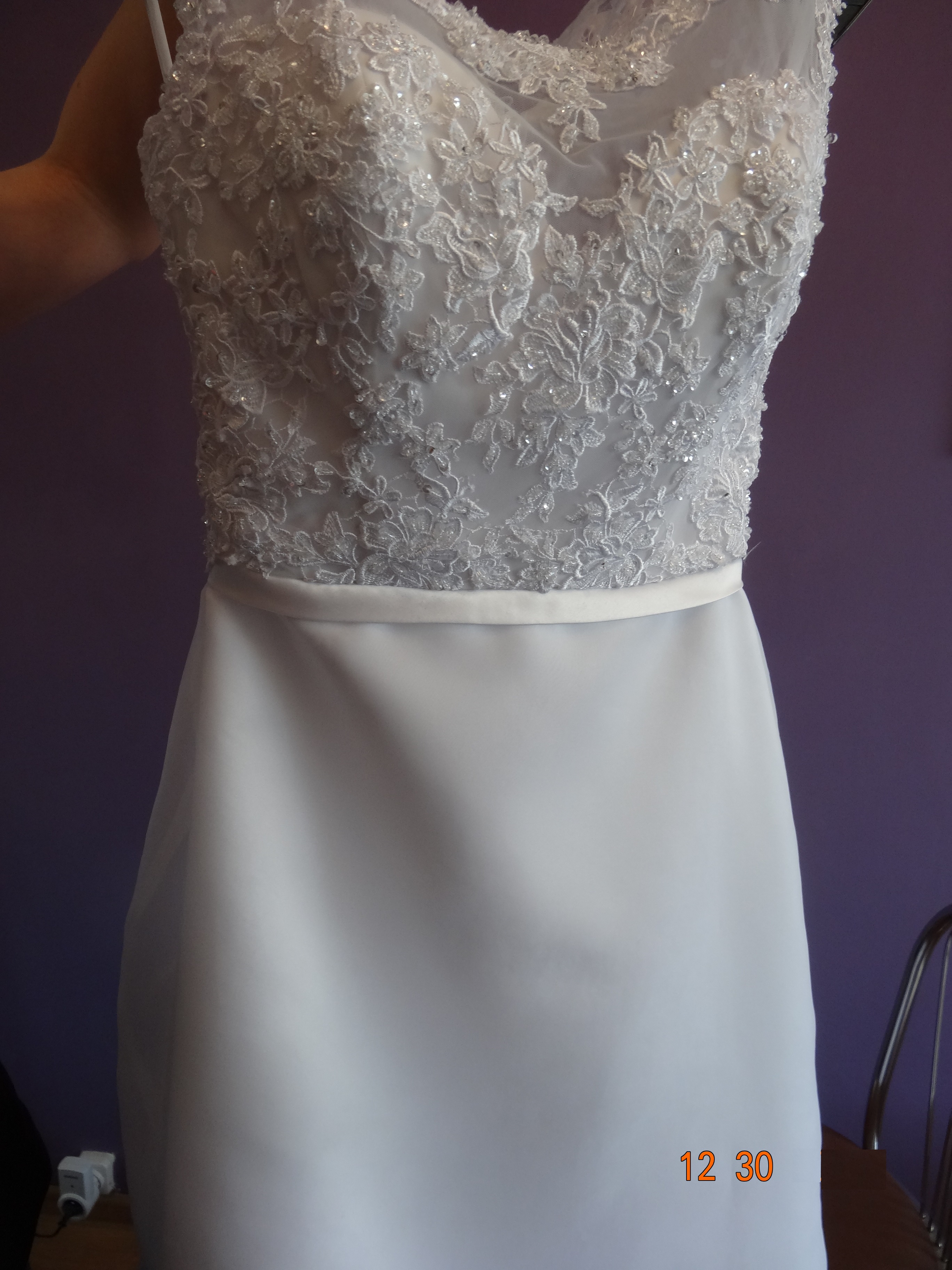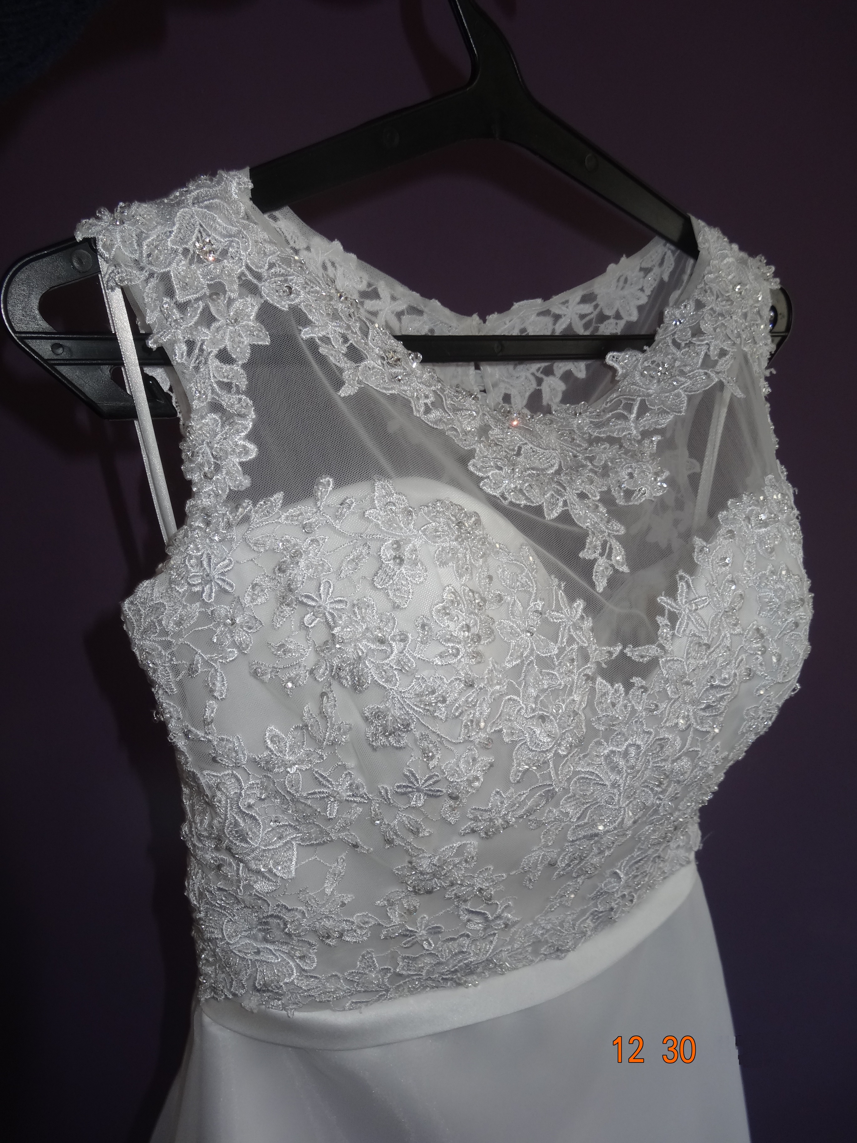 Suknia jest w kolorze śnieżnobiałym, dopasowana w biodrach oraz delikatnie rozkloszowana u dołu na kole. Dekolt zakryty tiulem i delikatną koronką. W biust wszyte wkładki push-up Plecy osłonięte tiulem z koronką, zapinane na guziki. Sukienka jest bardzo wygodna, lekka, nie krępuje ruchów.