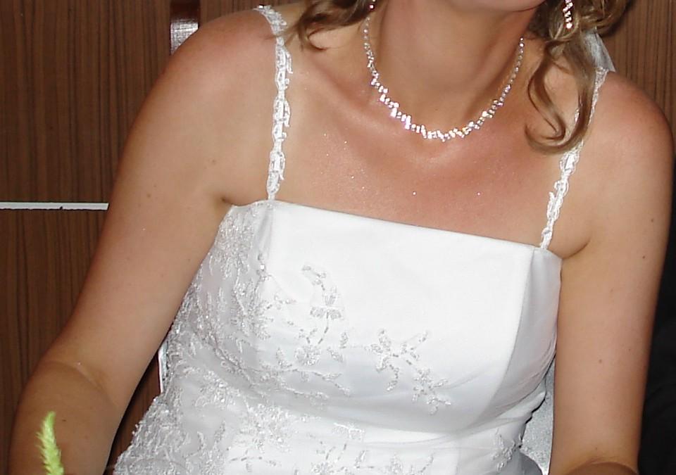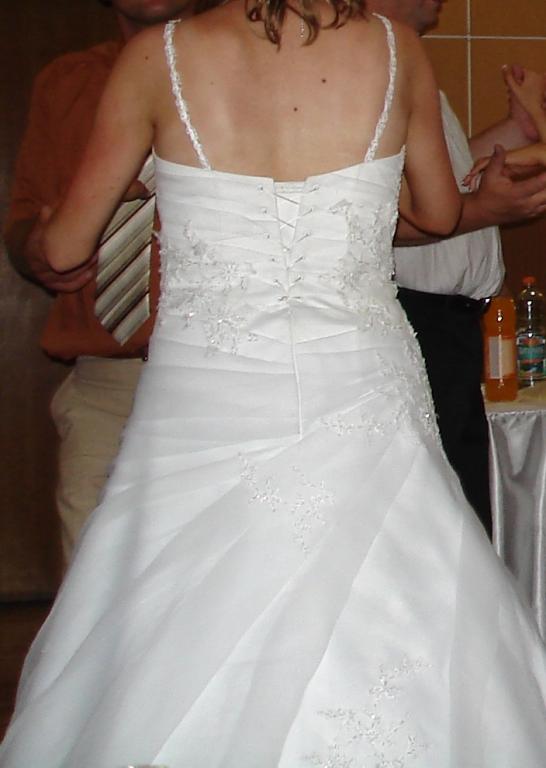 Sukienka jest w rozmiarze 38 - 40. Krój sukni to litera A. Jestem pierwszą właścicielką sukni. Suknia ozdobiona jest zakładkami, które przechodzą dookoła sukni, dodatkowo posiada na całym przodzie, boku oraz przechodząc na tył koronkę ozdobioną srebrnymi i przezroczystymi koralikami. Zdobienia umieszczone są również w trzech miejscach na dolnej części sukni. Suknia uszyta jest z organzy (tzw. gęsia skórka), posiada halkę na kole, która jest lekka i wygodna w tańcu. Tył sukni jest regulowany sznureczkiem. Sukienka jest na koronkowych ramiączkach, widocznych na zdjęciach. W razie pytań lub prośby o więcej zdjęć proszę pisać na maila aniulka174@interia.pl, lub dzwonić pod nr 502215045. Serdecznie polecam!!!