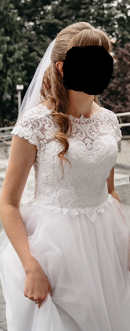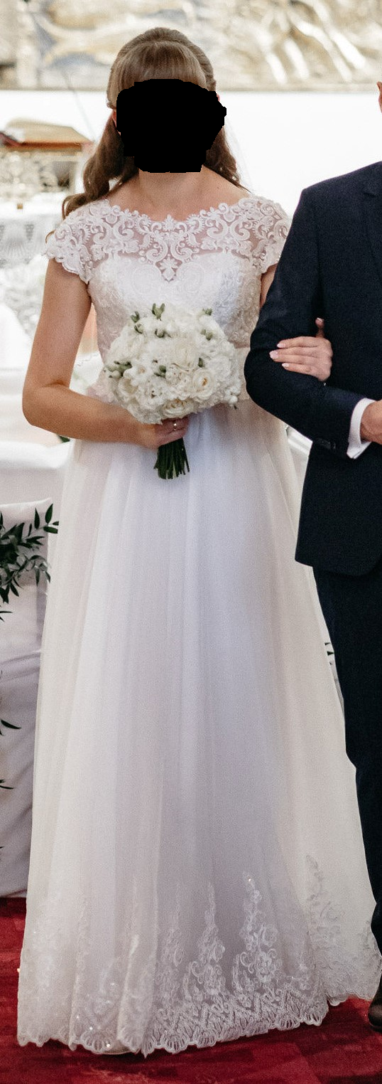 Sprzedam piękną śnieżnobiałą suknię z kolekcji 2019 + welon gratis. Przód i dół sukni jest elegancko wypełniony błyszczącą koronką. Tył sukni posiada wycięcie na plecach w literze V, zapinanie na guziki oraz proste sznurowanie. Nienaganny efekt sukni wypełnia tiulowy, gładki welon obszyty kryształkami Svarowskiego. Stan idealny, założona tylko w dniu ślubu i w jeden dzień sesji plenerowej.Sukienka jest wyprana i czeka na przyszłą pannę młodą w pokrowcu.Możliwość przymiarki sukni w okolicach Kalisza lub Jarocina. Wymiary: