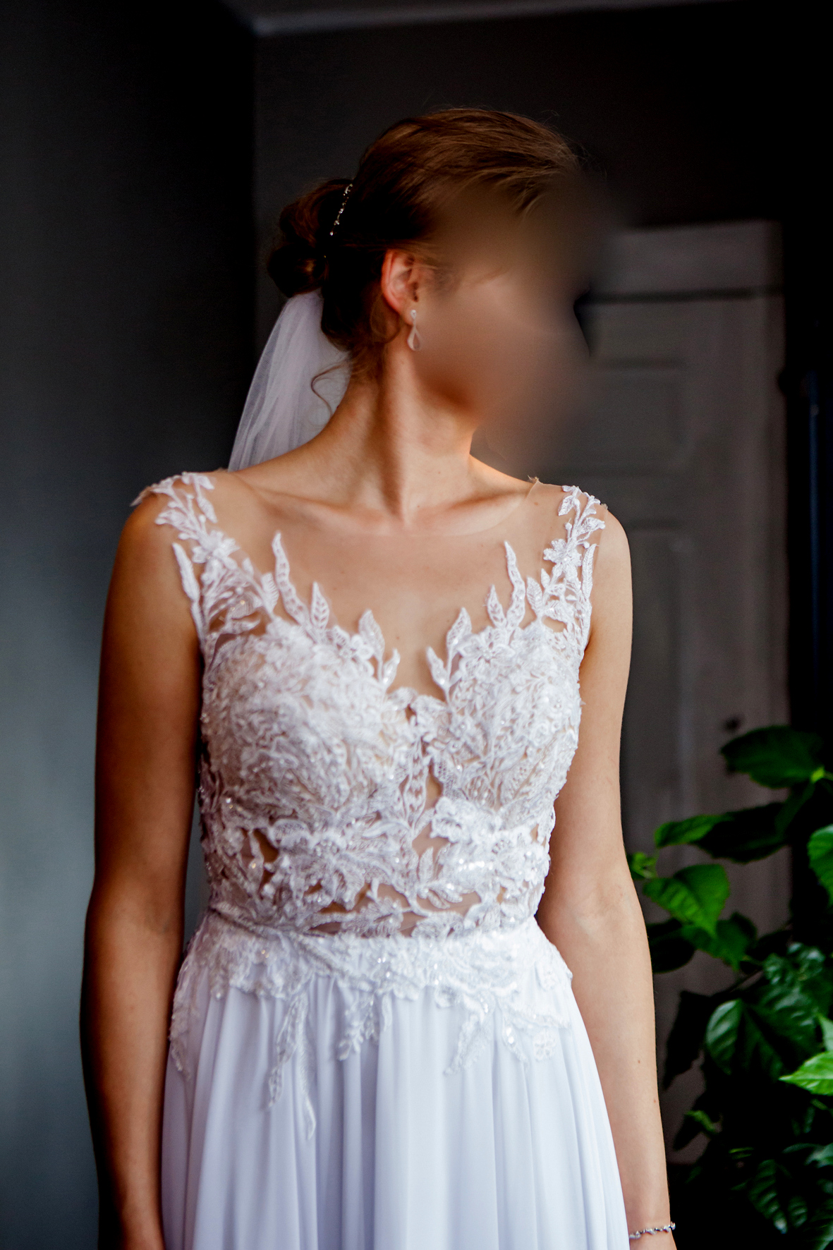 Koronka na części gorsetowej jest naszywana ręcznie , z tylu plecy wycięte w literę V . Suknia była używana tylko raz, jest w bardzo dobrym stanie. Do sukni dorzucam długi welon oraz biały wełniany szal.