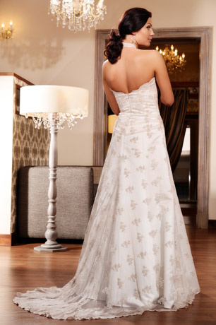 Sam model niezwykle elegancki: dopasowany w talii i biodrach, rozchądzący się w lekki klosz u dołu z przepięknym trenem. Tren jest podpinany na 3 guziczki.